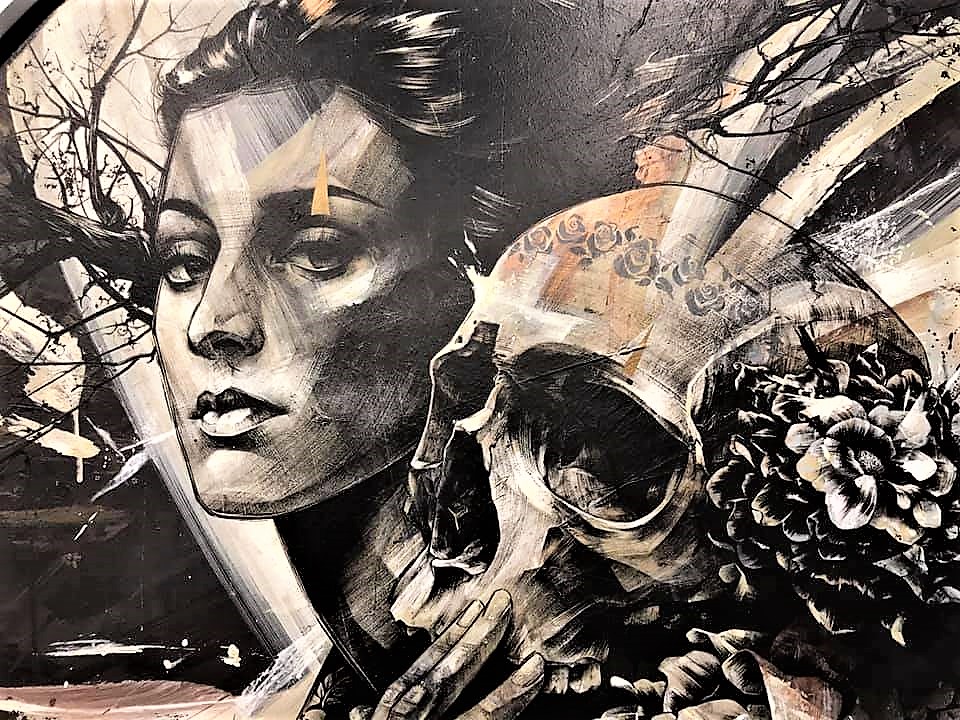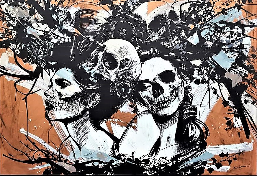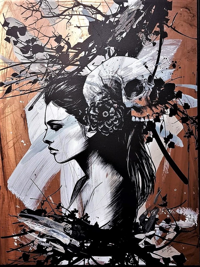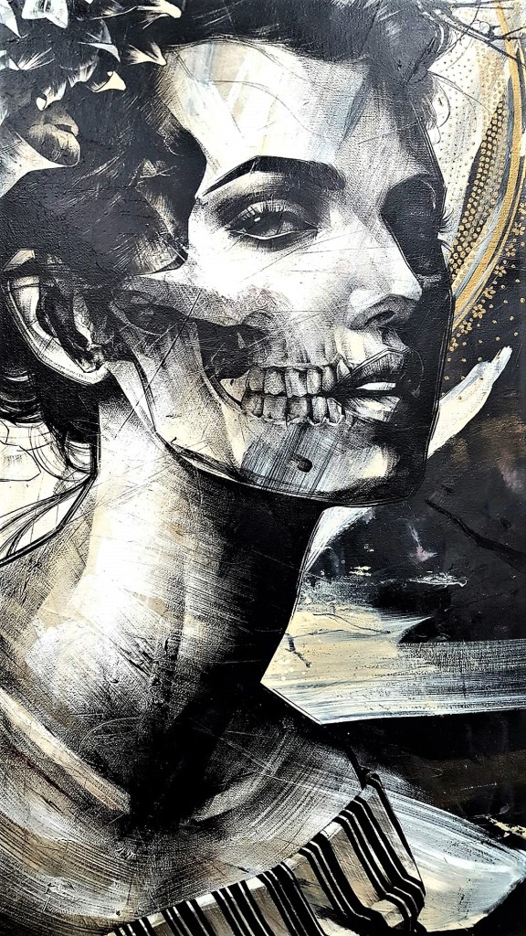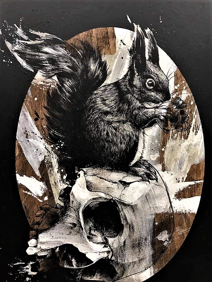 Les toiles de « Brûlures » déclinent le même message mais l’artiste y apporte distance et l’humour. Je fais référence à ce bel écureuil perché sur un crâne qui nous regarde. Impertinent, ignorant qu’il foule un objet sacré, il nous provoque. Il tient dans sa patte un crâne trop petit pour être vrai. Autre référence à ces portraits de femmes qui mettent entre parenthèse la thématique macabre pour célébrer la beauté.