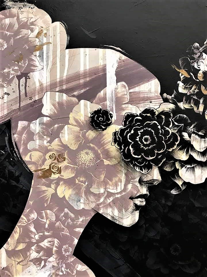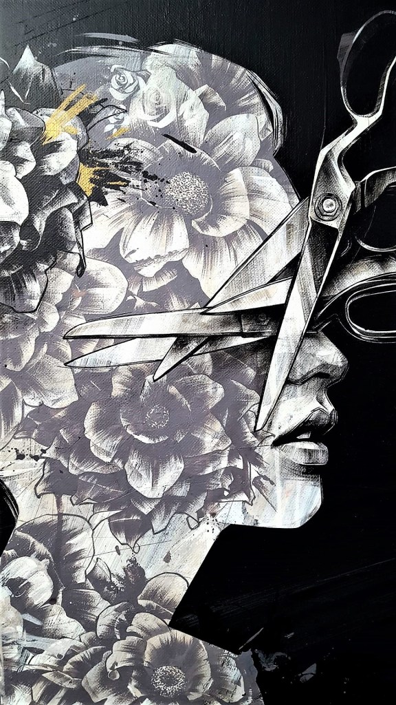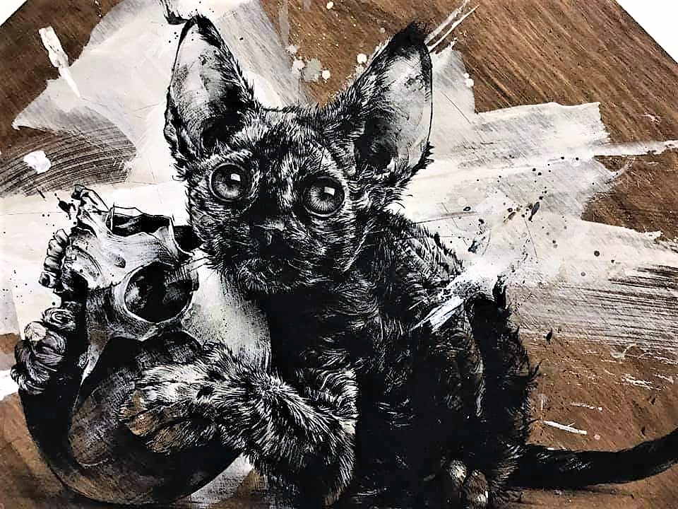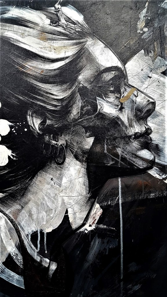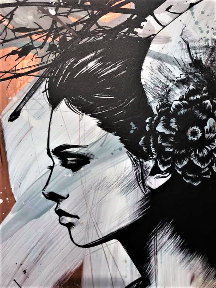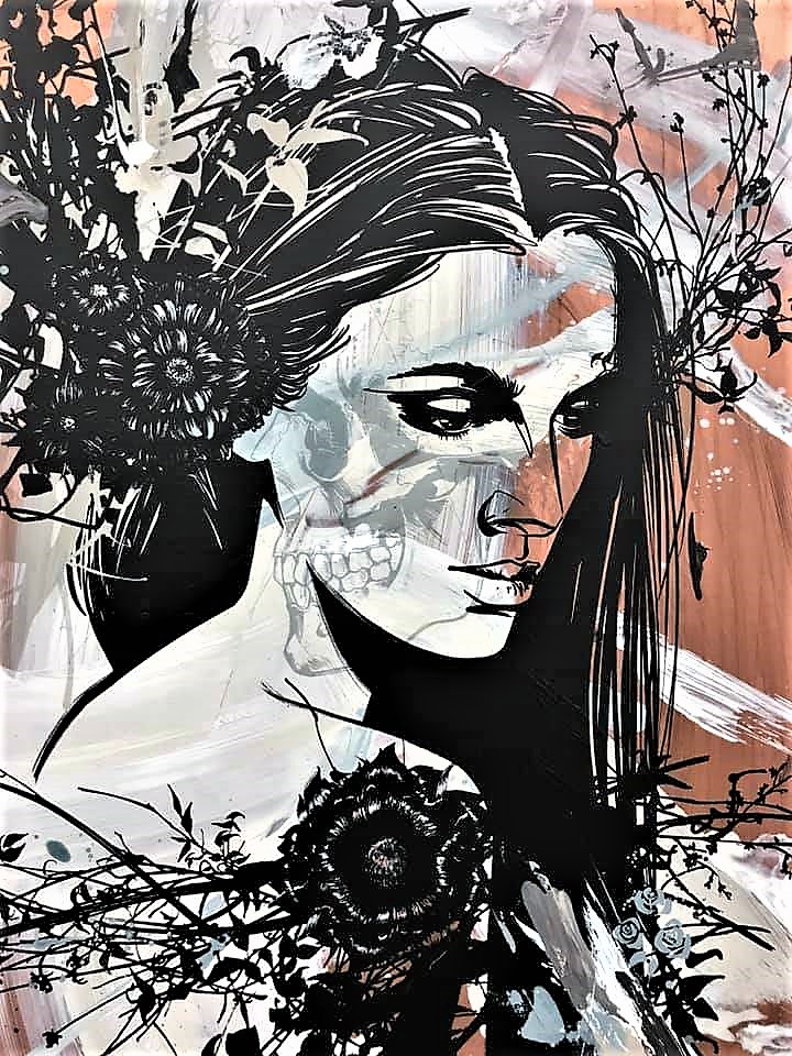 Les toiles de « Brûlures » déclinent le même message mais l’artiste y apporte distance et l’humour. Je fais référence à ce bel écureuil perché sur un crâne qui nous regarde. Impertinent, ignorant qu’il foule un objet sacré, il nous provoque. Il tient dans sa patte un crâne trop petit pour être vrai. Autre référence à ces portraits de femmes qui mettent entre parenthèse la thématique macabre pour célébrer la beauté.