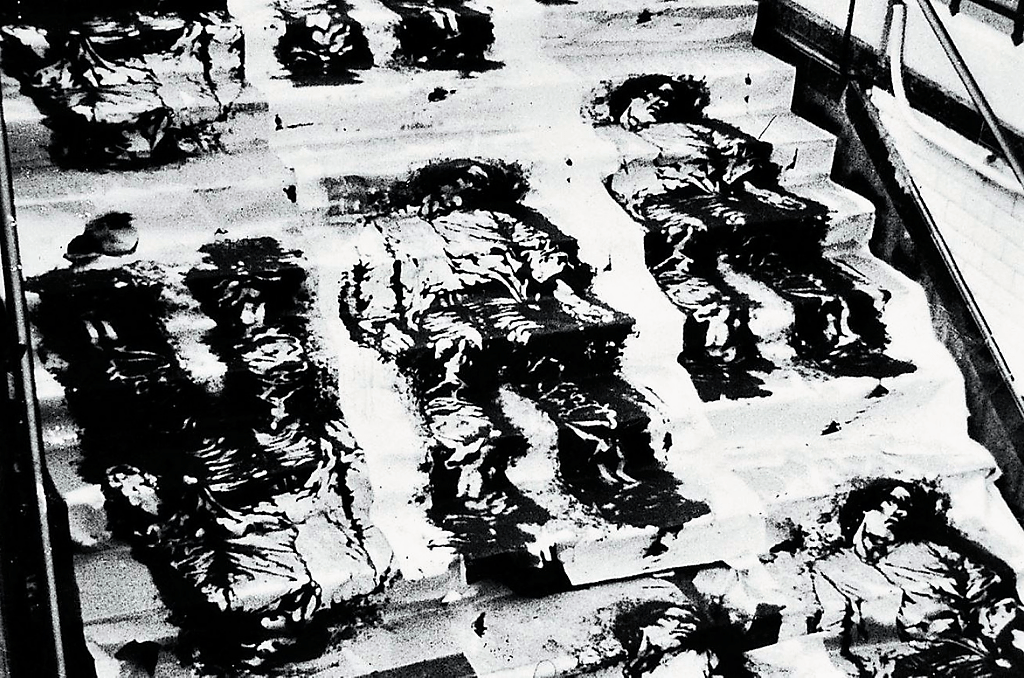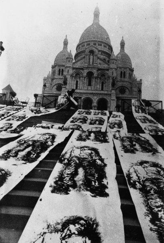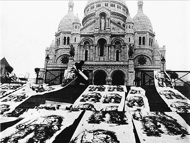 La radicalité politique est traduite par la radicalité de son intervention in situ. Littéralement, des milliers de Parisiens, un jour de mai 71, ont piétiné les cadavres des communards. Pour gravir les 222 marches du Sacré-Cœur, pour prendre le métro à la station Charonne, des milliers d’hommes et des femmes ont marché sur les cadavres des communards. Le message est d’une incroyable force et interpelle.