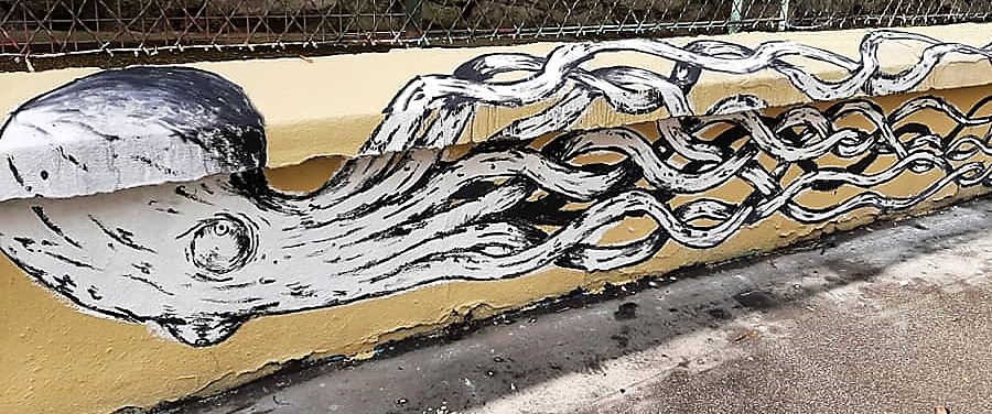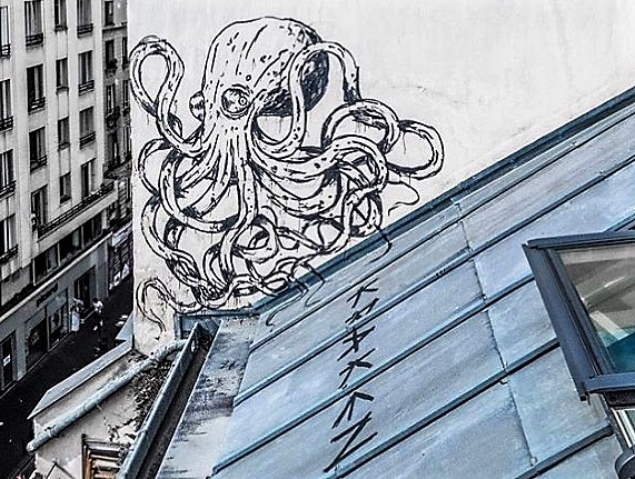 Lecteur, je te dois la vérité. Non seulement des êtres étranges, des Invaders ont envahi notre planète mais des monstres aux longs tentacules ont envahi les murs de ma ville. Depuis 2009 en effet, des krakens géants sont peints par Kraken, leur géniteur et maître, sur les sommets de nos murs. Ce sont d’étranges créatures qui peuplaient les légendes scandinaves. Les marins craignaient que leurs esquifs soient attirés vers les abysses pour les noyer dans les profondeurs obscures. Créatures ressuscitées par Kraken. Pas M. Kraken…Kraken. C’est le blaze qu’a choisi cet artiste qui signe son passage en peignant en noir de troublantes et belles pieuvres, représentations du kraken des légendes.