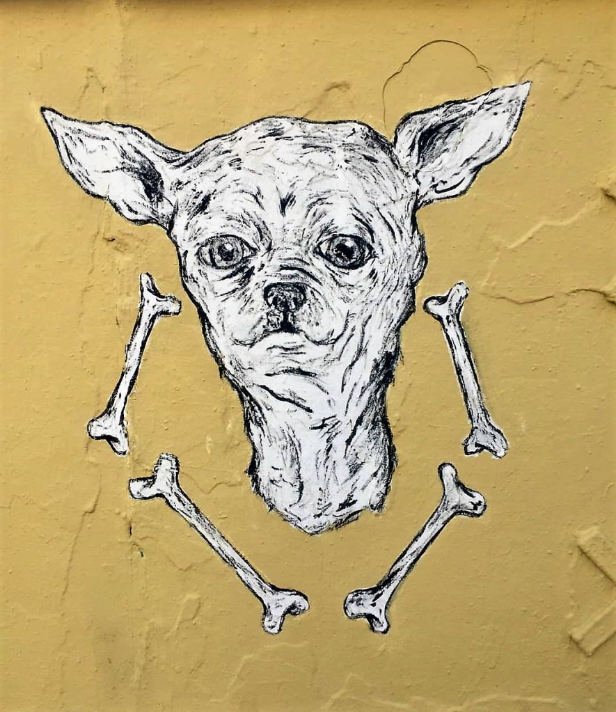 Ajoutons que tous les krakens ne sont pas peints de manière systématique au-dessus des symboles du veau d’or. Ils le sont sur de beaux murs et la forme du kraken s’adapte à la surface. La plasticité de la pieuvre est en cela un précieux atout graphique. Elle n’a pas comme nos communs mammifères la tête en haut et les pattes en bas ; elle peut avoir la tête en haut certes mais les tentacules où l’on veut, ou bien horizontaux, ou cul par-dessus tête. J’ai souvenir de la lecture d’un article scientifique fort sérieux qui démontrait que la pieuvre, le poulpe comme on voudra, n’a pas de forme ; il peut prendre la forme de tous les contenants puisque son corps, qui n’a pas d’os, est mou. Avouons que cela est bien pratique pour un artiste qui doit faire avec la nature souvent ingrate du support et les contraintes de la surface. Quelle que soit la posture représentée du kraken, le regardeur reconnaitra à coup sûr le kraken. De plus, l’artiste signe l’œuvre de son blaze, en lettres majuscules.