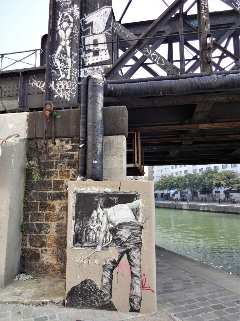 C’était le jeudi 9 octobre 2014, par un matin d’automne, le ciel était plombé, une pauvre lumière baignait le quai du canal de l’Ourcq, je promenais mon chien. Je me rapprochais de la passerelle de la Petite ceinture et je découvris deux collages de Levalet qui allaient être le point de départ de notre histoire commune. La passerelle d’aujourd’hui fut un pont sur lequel roulèrent les trains de la Petite ceinture, un pont-passerelle qui relient les deux parties du XIXème arrondissement de Paris. Le pont a également facilité le franchissement du canal de nombreux fluides. Restent nombre de tuyaux et d’innombrables câbles dont on a aujourd’hui oublié les fonctions. D’un drôle de parallélépipède de ciment sort d’énormes tuyaux reliés à d’autres tuyaux qui se perdent dans le dédale du pont ruiné. Sur une face, Levalet a collé une « affiche » peinte à l’encre de Chine qui représente un soutier qui alimente un four à charbon. Sur une autre face, est peint un ouvrier qui s’éponge le front harassé par son travail.