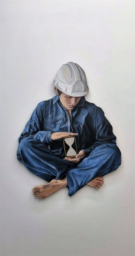 Un monde industrieux mais condamné. L’ouvrier agenouillé qui avec sa truelle dans le ciment frais plante un lys blanc est une métaphore d’une fin du monde annoncée. Le même ouvrier qui, assis en tailleur, regarde couler le sable d’un sablier compte le temps qui reste. A moins que notre temps, celui de notre civilisation moderne, soit déjà dépassé comme le suggère le portrait de cet ouvrier plongé dans une végétation qui le recouvre en partie. Comment ne pas penser au Dormeur du val de Rimbaud, cesoldat mort allongé au bord d’un ruisseau.