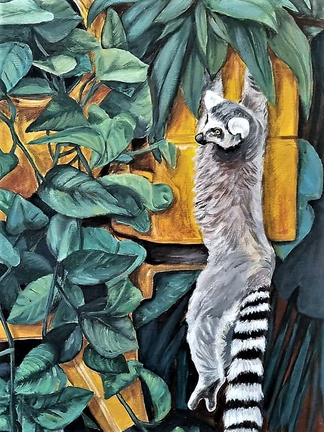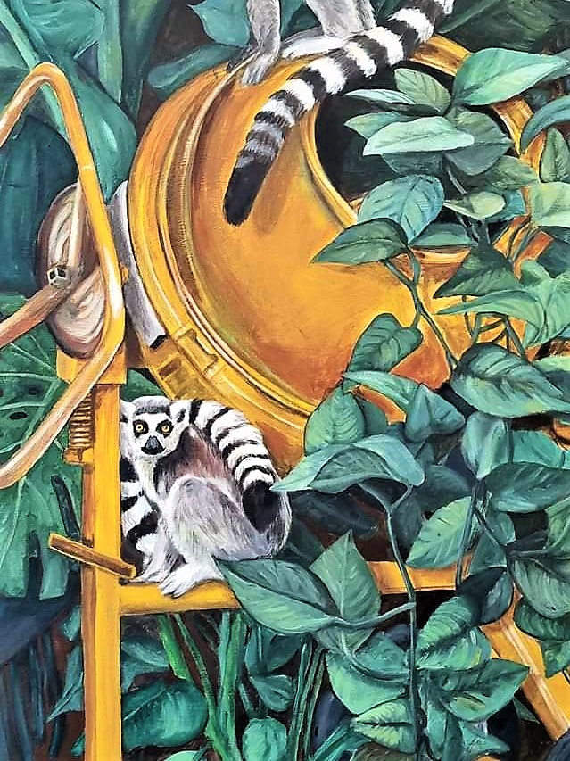 Du surprenant mélange d’un chantier de construction et d’une forêt tropicale est née une série d’œuvres qui sont autant de déclinaisons du thème central. Le ruban de balisage revu et corrigé par l’artiste devient une profusion de lianes auxquelles se suspendent des suricates voire un piège redoutable dont l’homme moderne peine à se défaire. Les toiles sont des « tableaux » de scènes de la vie ordinaire de ces charmants petits animaux aux yeux malicieux qui s’amusent de nos outils et de nos machines bizarrement déplacées dans une forêt qui grouille de vie. Exubérance des suricates, exubérance de la végétation. Comme un chantier abandonné dans une forêt tropicale humide. Comme une fin du monde. Une nature qui sans l’homme est belle et les animaux superbes et insouciants.