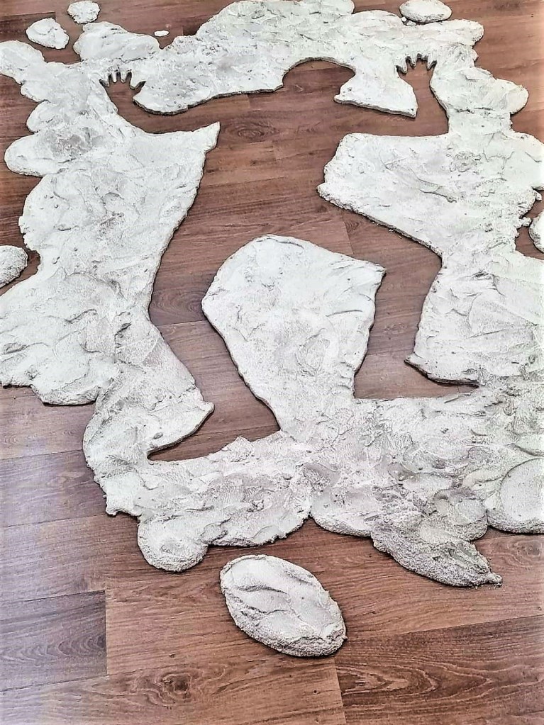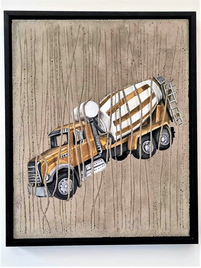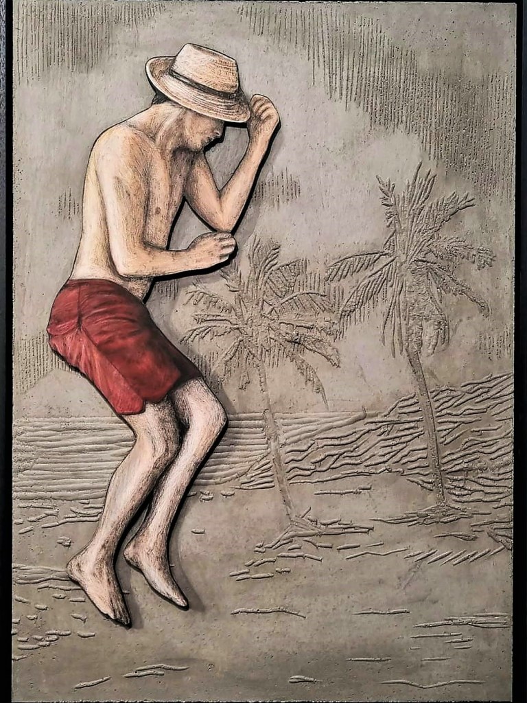 Le thème du chantier de construction introduit dans son travail d’atelier un nouveau matériau : le ciment. Comme les suricates, il joue avec le ciment, le béton. Il construit des volumes, lui le peintre qui d’ordinaire travaille sur deux dimensions. Il combine peinture et sculpture, traçant des sillons, sculptant un squelette qu’un archéologue exhume, il dessine « en volume » des palmiers.