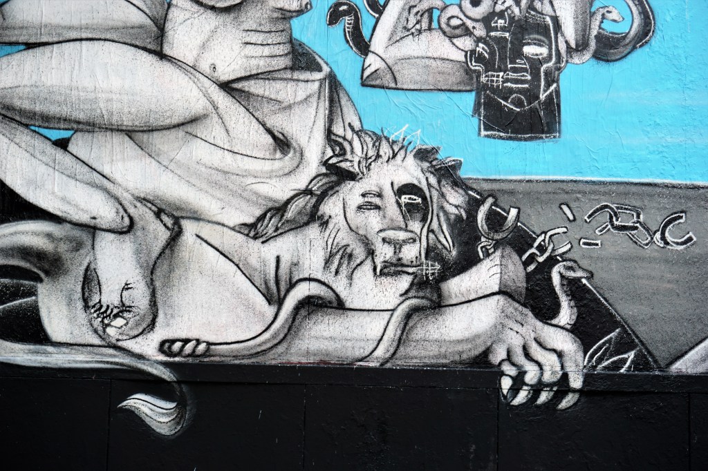Dans une vidéo réalisée par l’association LE M.U.R. l’artiste donne le sens de son œuvre. Peinte pendant le deuxième confinement, l’artiste fait référence à la sidération des Français confrontés aux contraintes sanitaires qui ont limité les libertés individuelles et collectives. Les citoyens, d’après Jackson, sont restés figés comme s’ils regardaient la tête de Méduse, acceptant sans broncher des chaînes. Comme le lion, son œuvre doit participer à la prise de conscience de l’état de nos libertés et briser les chaînes qui nous entravent. Le message est politique : le peuple doit reconquérir ses libertés perdues.