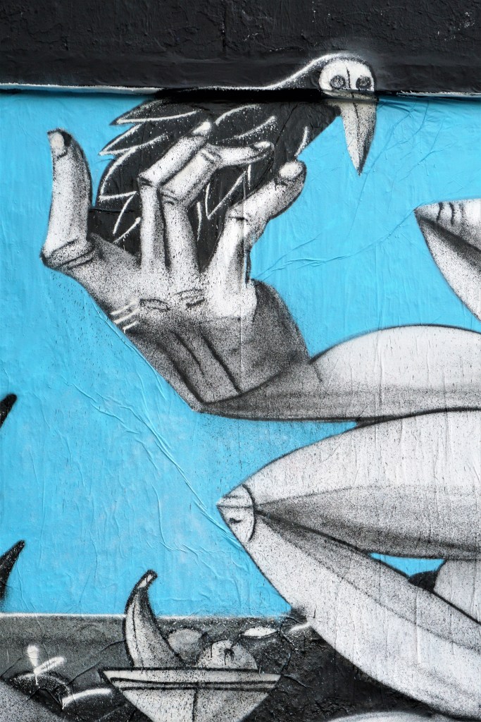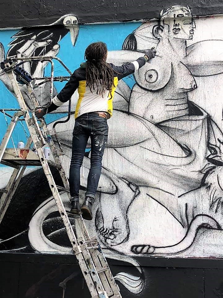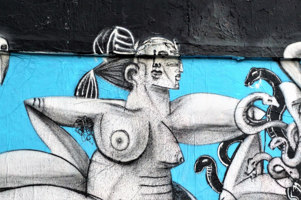 Le samedi 21 novembre 2020 l’association LE M.U.R. a invité l’artiste Onie Jackson pour une performance live. De prime abord, l’œuvre surprend. Son décor évoque un paysage quelque peu lunaire composé au premier plan de trois portions de sphère, grises et noire, d’un horizon gris anthracite monochrome, d’un ciel d’un bleu vif qui participe à la mise en valeur du sujet principal. Quelques hautes feuilles végétales, une coupe de fruits et une tête d’oiseau accentuent l’aspect surprenant de l’œuvre. Sur ce fond épuré surgit une femme puissante portant dans sa main droite un oiseau noir qui fait pendant à l’oiseau gris et de la main gauche la tête de Méduse. La Gorgone a gardé des traits de sa représentation antique, un visage vu de face ayant comme chevelure des serpents, et des traits hérités de la période classique, un visage de femme. La femme aux membres disproportionnés semble assise, un lion a ses pieds ayant rompu ses chaînes. Elle a la poitrine nue, le bas du corps ceint d’une ample étoffe. La femme, la tête de Méduse, le lion, les deux oiseaux, la coupe de fruits et les feuilles sont peints en noir et gris. Bien que le trait domine, le relief des diverses représentations est figuré par des ombres. Les sujets ombrés, en volume, s’opposent au décor qui bien qu’ayant un point de fuite apparait comme une toile de fond. Sans aucune ambiguïté, le style est cubiste et se présente comme une œuvre à la manière de Picasso. Nous reviendrons plus avant, sur cet héritage.