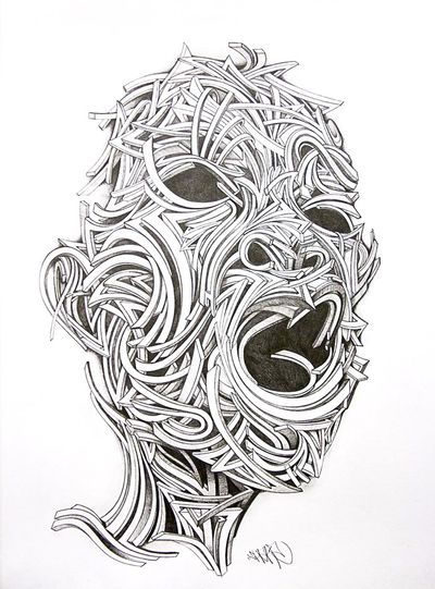 Les « rubans » et leur entrelacs subtil composent des portraits, des personnages en pied, des scènes. Trait typique de l’art de Shaka, il ne peint que des personnages. Parfois des visages exprimant des émotions, des personnages symboliques comme Marianne, des scènes mettant en relation plusieurs personnages. De manière symptomatique, Shaka ne représente pas les « éléments de décor ». Ses personnages sont dessinés ou peints dans l’espace du plan. Ils revendiquent le statut de création de l’esprit. Ils n’imitent pas les acteurs d’une scène naturaliste. Ce sont des dessins, des fresques, des « murals », objets-en-soi et non des imitations de la nature et des conventions de représentations qui y sont attachées. Pas de pluralité des plans dans le travail de Shaka, pas de paysage, pas d’environnement. Car ces personnages sont pures créations qui ne singent pas la nature ou si peu. Bien sûr, nous reconnaissons les traits d’un visage. Ou plutôt, nous recombinons les « rubans » pour, à notre tour, recréer la création. En ce sens, l’œuvre de Shaka est une œuvre radicale.