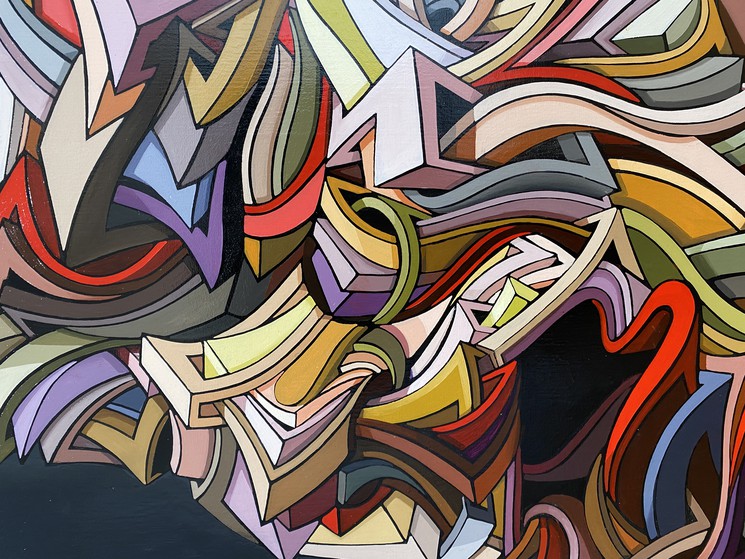 Shaka sur la scène street art française est une exception et son œuvre échappe à toute catégorisation. Elle ne doit rien au graffiti, pas grand ’chose à la peinture de chevalet. Elle est bien davantage apparentée à la sculpture y compris l’œuvre graphique. Le raffinement, la sophistication des œuvres crée un rare plaisir au regardeur dont le regard se perd dans les circonvolutions des rubans dont l’entrelacs crée l’illusion du volume. Notre regard suit le chemin tracé par les rubans et s’égare. C’est le parcours de notre regard qui donne à l’œuvre une seconde naissance. En cela, le travail de Shaka a plus à voir avec un art contemporain cinétique et conceptuel.