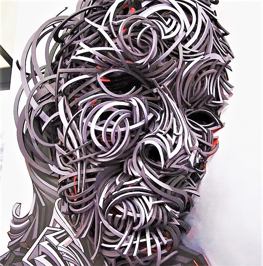 Surprise tout d’abord dans le « process » mis en œuvre. On a le sentiment que l’artiste dans un premier temps décompose une représentation d’une réalité en volume en longs rubans ayant une épaisseur et, dans un deuxième temps, reconstruit le sujet à l’aide de multiples rubans qui s’enchevêtrent suggérant la profondeur et le relief. Un process fondé sur une déconstruction et une reconstruction.