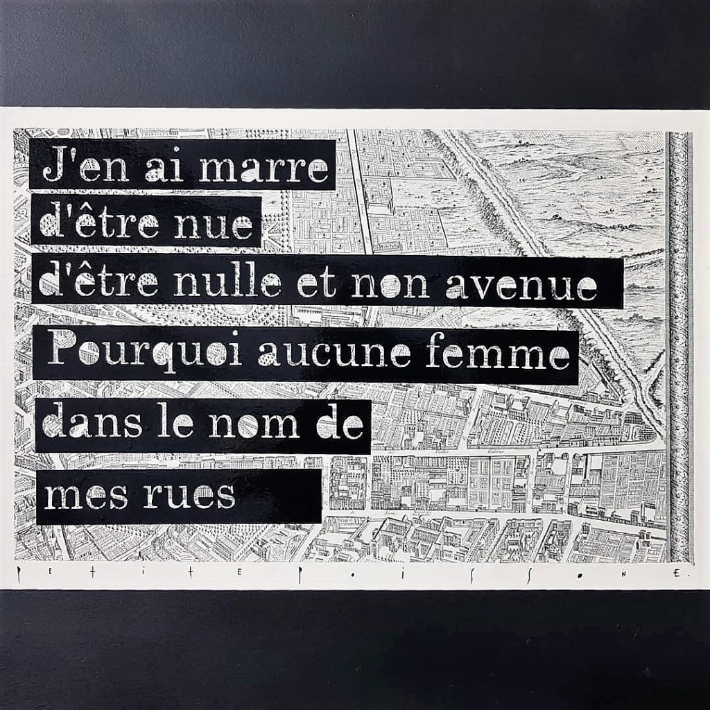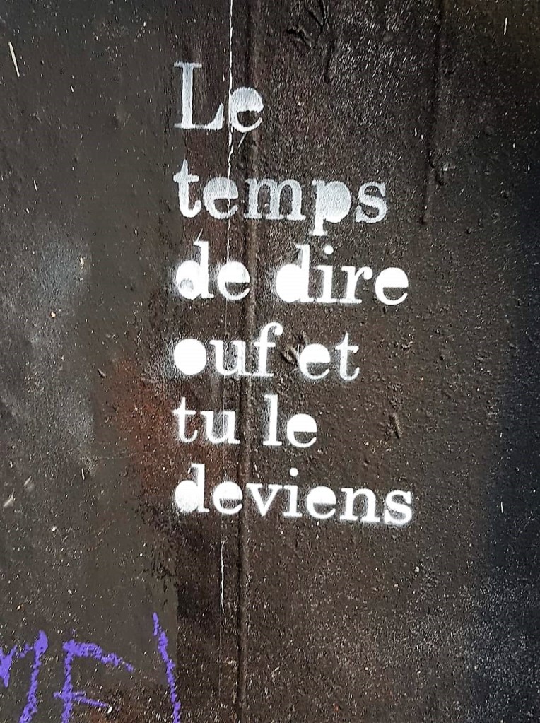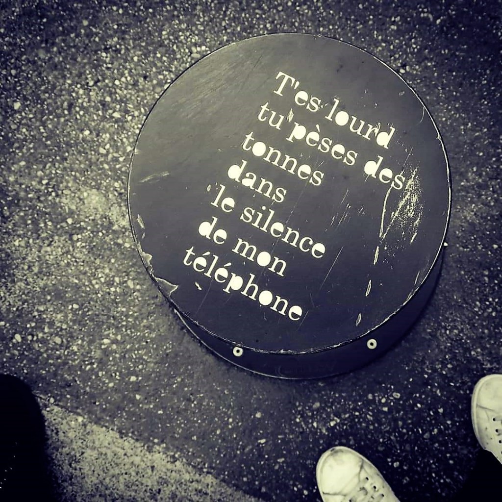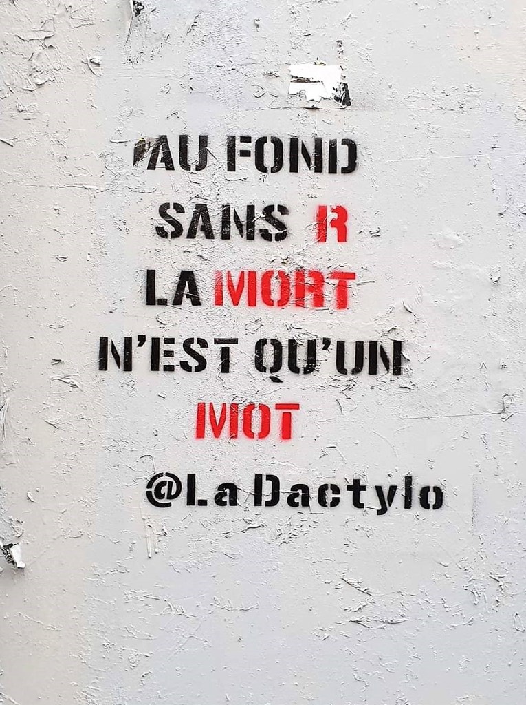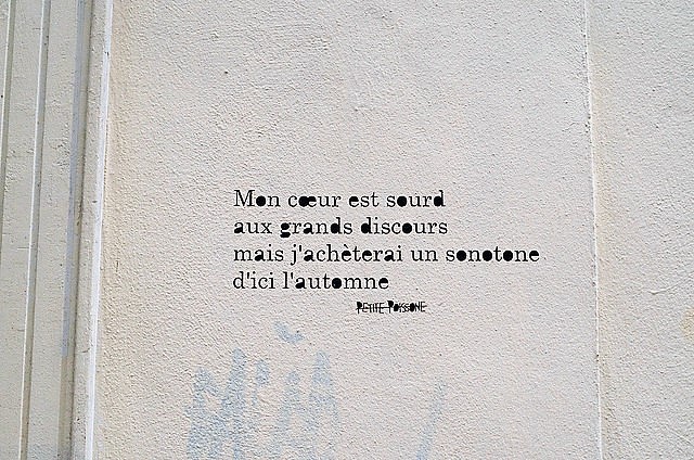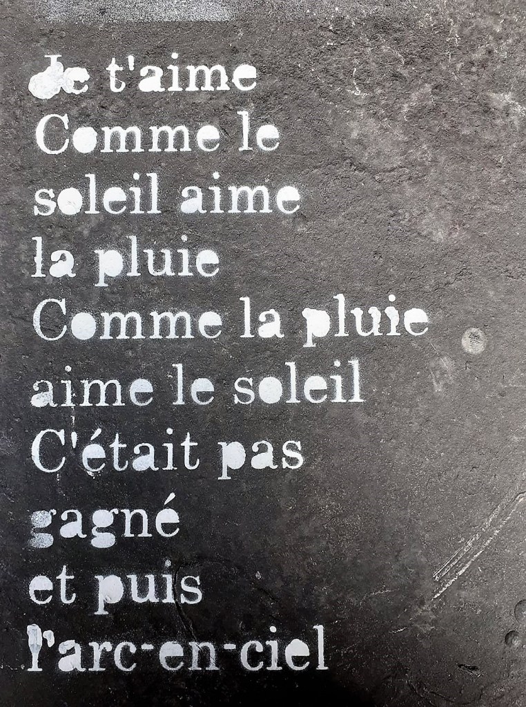 J’ai choisi de commencer par un « passage à la limite », l’écrit affiché ou peint dans la rue, sans illustration. Mon « oublieuse mémoire » se saurait dater l’apparition dans la rue de textes. Toujours est-il que depuis une dizaine d’années les murs de nos villes se couvrent d’écrits divers et variés. Beaucoup de ces textes sont anonymes mais d’autres sont l’œuvre d’artistes dont il est difficile de dire s’ils sont des poètes ou des street artistes. Le fait que les photographies de ces textes soient publiées sur des sites dédiés au street art montre que ceux qui les mettent en ligne sur les réseaux sociaux les identifient comme appartenant au street art. Des noms émergent de cet ensemble hétéroclite : La Dactylo, Petite Poissone, Le Baron, Pablo Savon, Lisa Lensk, Ben. La liste n’est guère exhaustive bien sûr. Mon « échantillon » est parisien et l’exercice qui consiste à peindre sur des murs des pochoirs ou à y coller des « affiches » est régi par une certaine proximité entre le lieu de vie de l’artiste et les lieux dans lesquels il « expose » son travail.