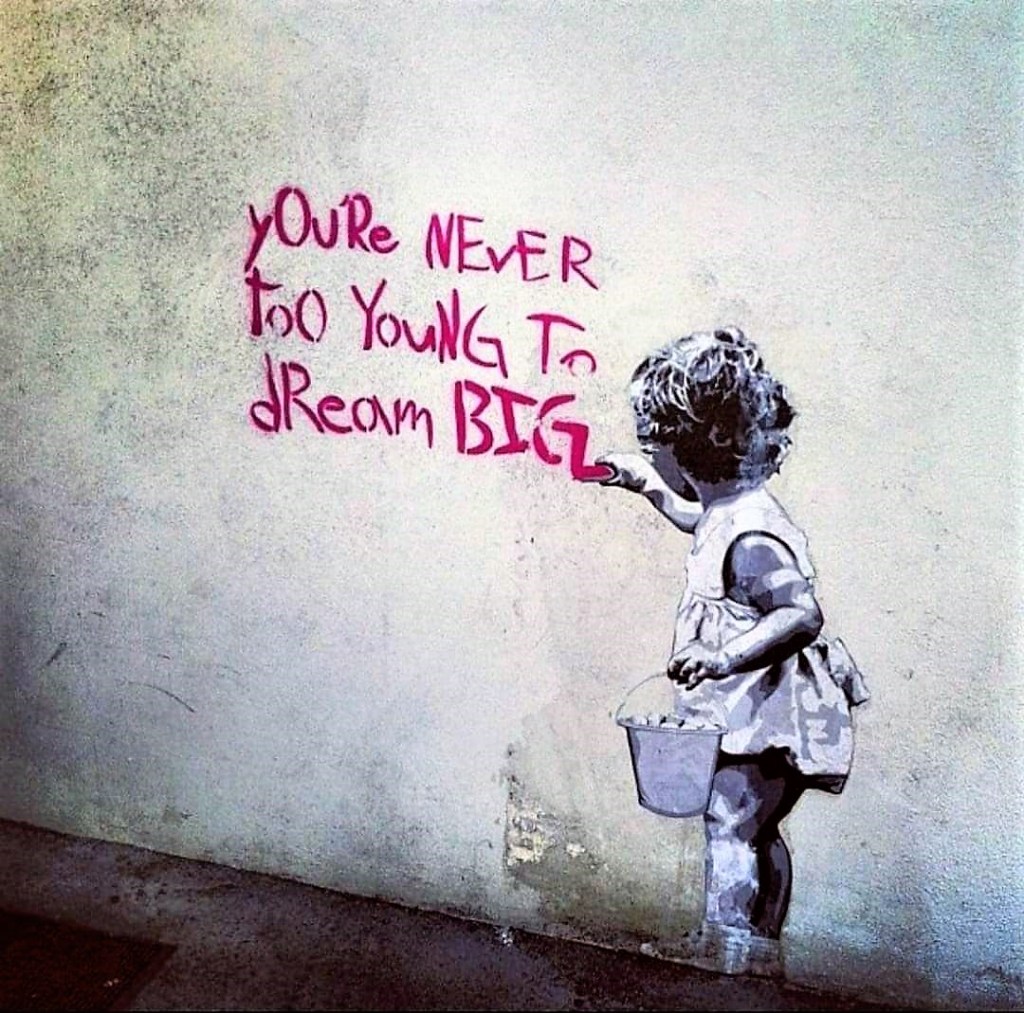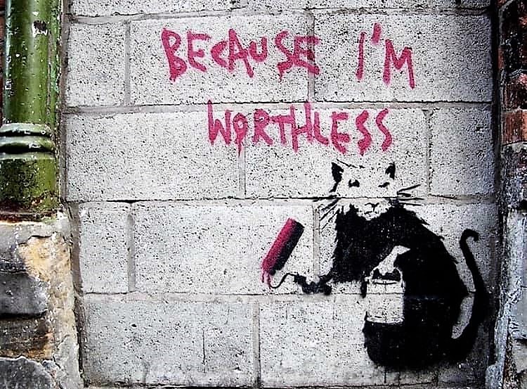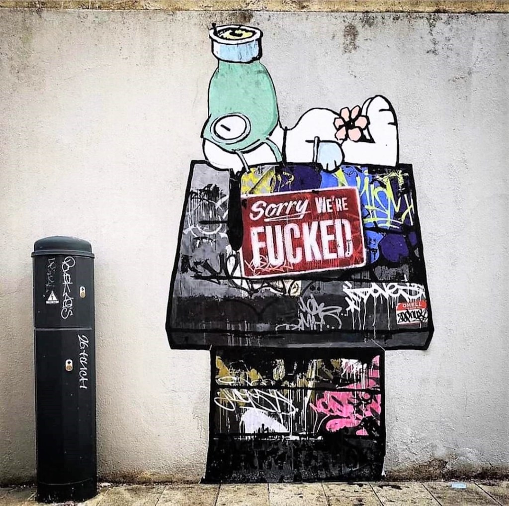 Cette volonté de se démarquer apparait également dans la représentation de personnages soit inventés par l’artiste soit appartenant à la culture dominante qui écrivent sur le mur ce que l’artiste a à dire. Le street artiste écrit dans ce cas de figure également par procuration. Le décalage entre ce que sait le « regardeur » du personnage et ce qu’il écrit sur un mur est une source d’effets comiques assurés !