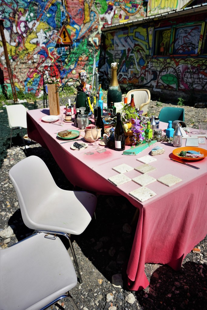 Quant au terrain couvert de gravats provenant du chantier de démolition, il est devenu un espace organisé que l’artiste s’est approprié. Il a d’abord marqué les limites de son « domaine ». Deux sculptures anthropomorphes symbolisant des guerriers gardent l’entrée. Des allées ont été dégagées et mènent à des espaces plus ou moins thématisés : une salle à manger avec une table dressée, un parterre de fragments de mosaïques au centre duquel trône une statue ou plutôt un mannequin déglingué qui la représente, un salon au canapé défoncé etc. Le hangar conserve certes une partie de ses gravats mais ils ont été non pas aménagés mais transformés. Des morceaux de murs ont été peints, des portes décorées ajoutées, des fenêtres peintes : ils sont devenus les matériaux d’une création. D’énormes tas figurent des monstres dont les gueules vomissent des gravats.