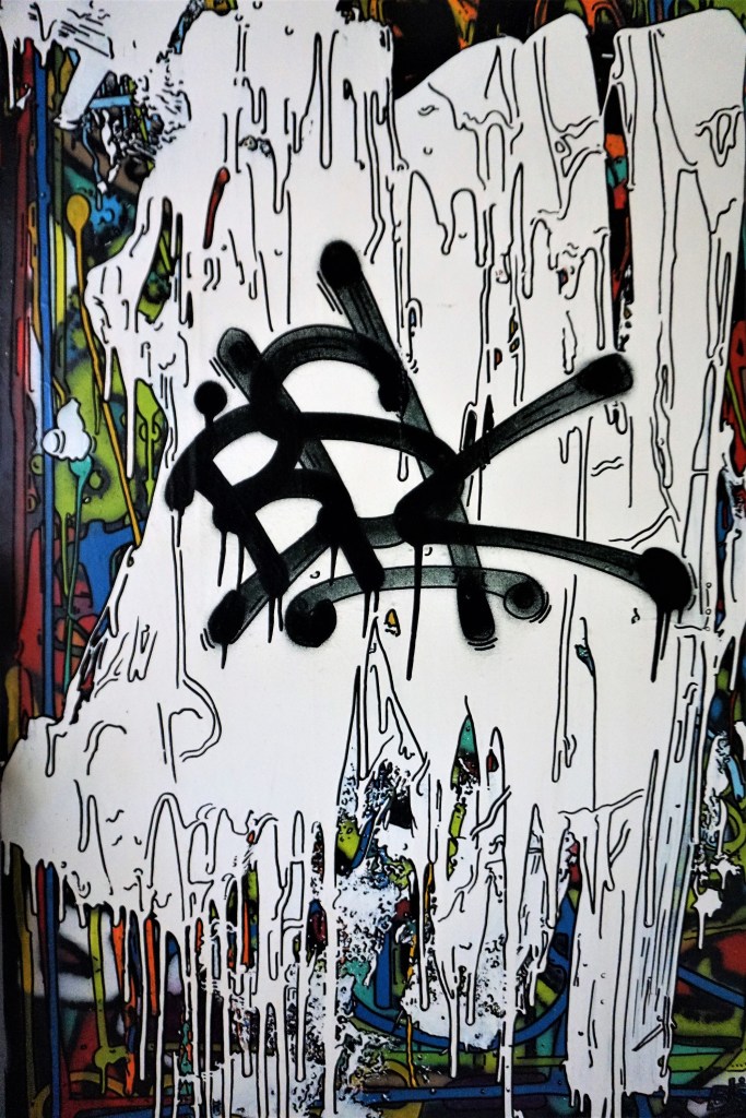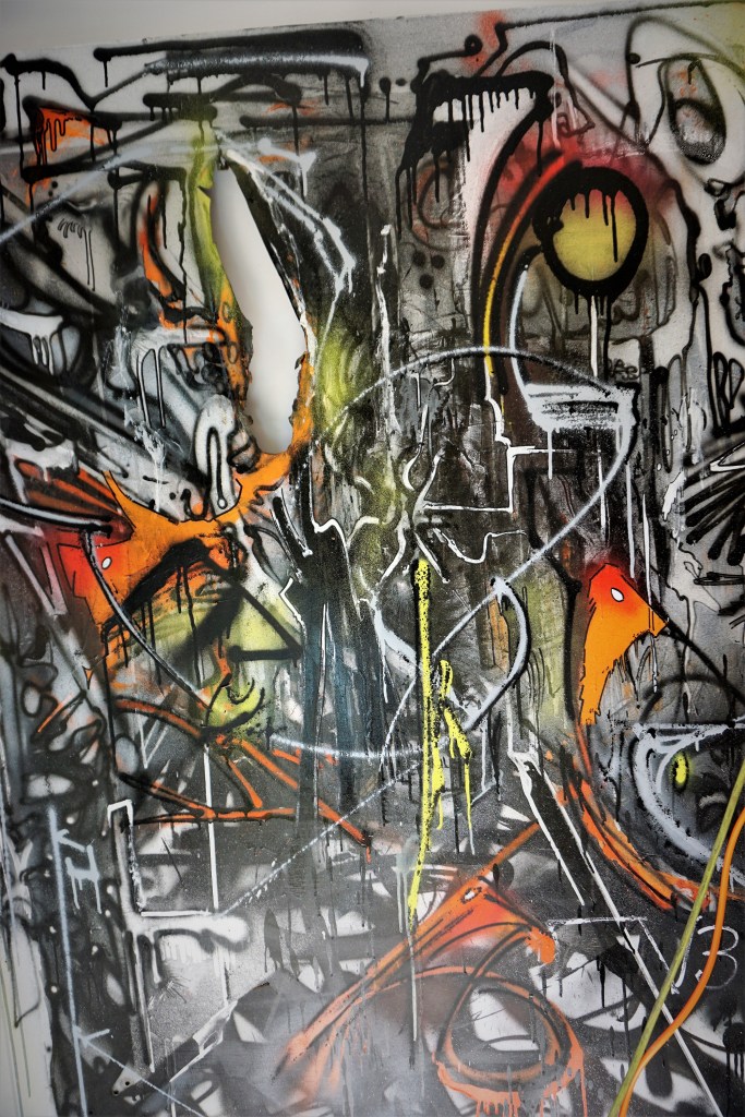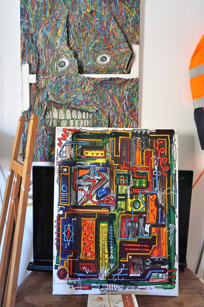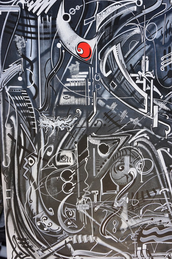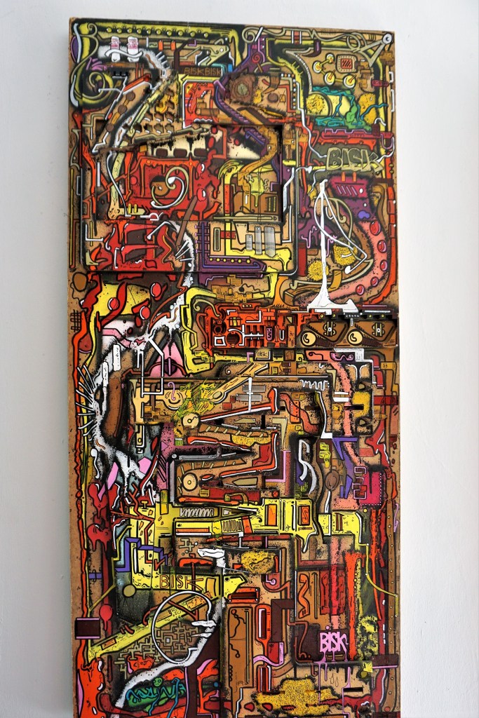 Il serait aisé d’y voir une métaphore de notre société qui produit tant de déchets qu’elle croule sous les ordures qu’elle produit. Une société dont l’existence même est menacée par les sous-produits toxiques de son fonctionnement. Cette interprétation, pour évidente qu’elle soit, n’est qu’une image de surface, une signification trop simple et trop banale pour résumer le projet artistique de Bisk. Si on regarde de plus près ce que l’artiste donne à voir, on voit que les morceaux cassés de carrelages ne sont pas disposés au hasard mais qu’ils forment une composition de toute évidence réfléchie. Les murs sont couverts de tags, de graffs et de fresques organisés selon un ordre sous-jacent qui évite la symétrie lui privilégiant la dissymétrie, l’alternance et le contraste et la spontanéité de la création. Des bouts de bois sont peints de motifs décoratifs que nous retrouvons dans les toiles de l’artiste. Il en est de même de tout un ensemble d’objets récupérés, objets qui deviennent les supports d’une décoration peinte avec une liberté qui étonne. Des courbes tracées avec des feutres fins, des boucles, des spirales, de savantes arabesques tracées dans l’inspiration du moment transmutent les scories en œuvres d’art.