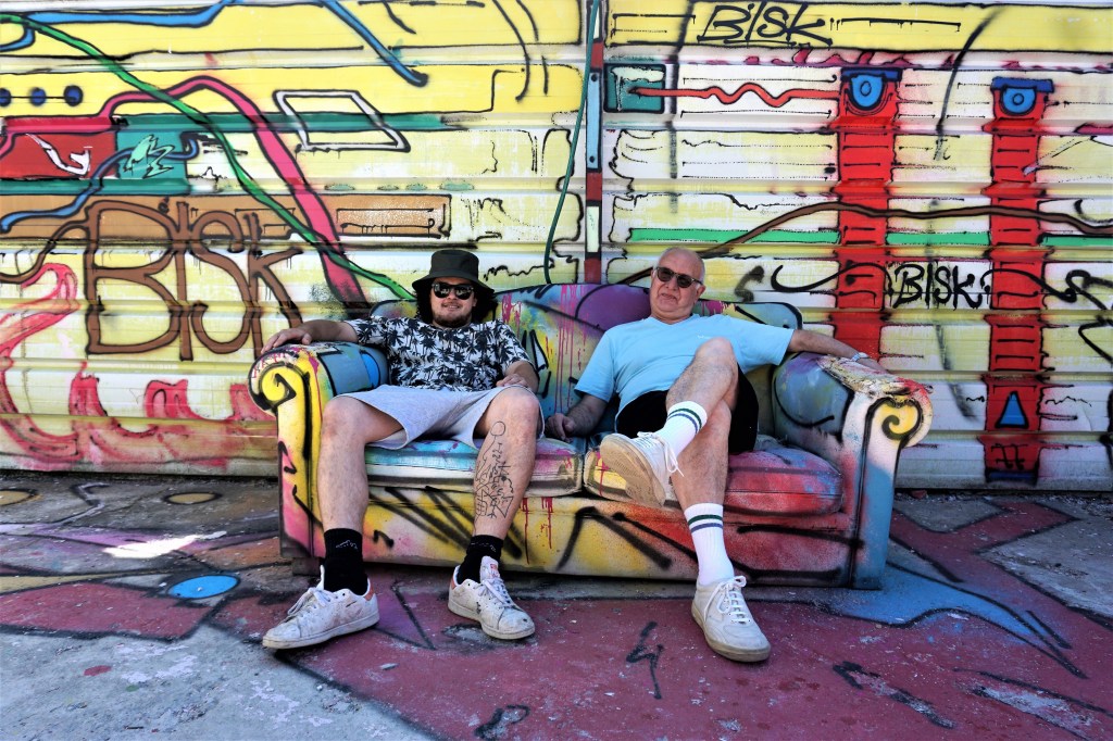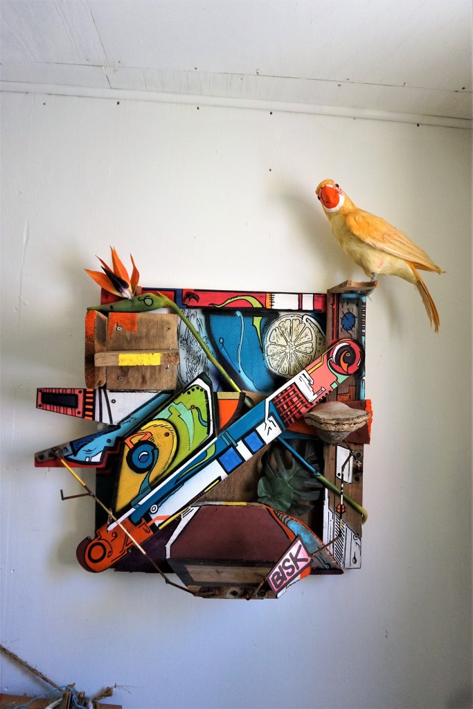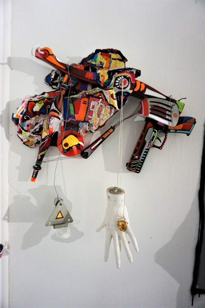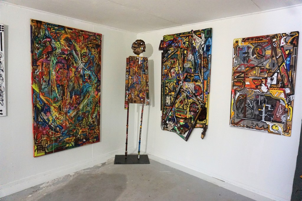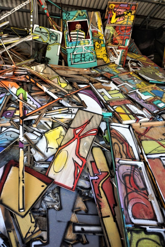 Les murs sont peints, les gravats aussi, tout comme un immense capharnaüm d’objets morts dans leur fonction première, objets considérés comme des supports à la créativité. La comparaison avec les toiles est éclairante : Bisk a transféré sur un monde de rebuts son univers graphique. En « décorant » des objets qui ont perdu leur fonctionnalité première, Bisk les intègre à son univers.
