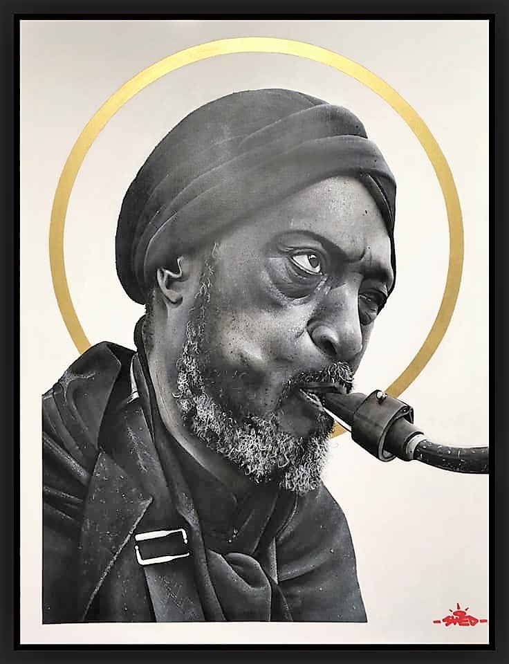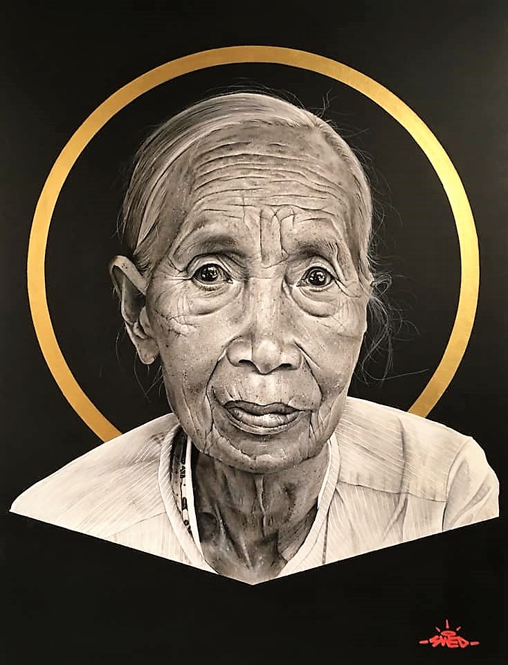 « Mon nom d’artiste est Swed. Je suis originaire d’Uzès, dans le sud de la France et je suis street artiste. Je réalise des portraits noir et blanc, assez réalistes, des gens que je rencontre et avec lesquels je discute. Je les prends en photo ensuite pour réaliser leur portrait. J’essaie de représenter les personnes dans leur environnement, à savoir, dans leur rue, dans leur ville, dans l’endroit dans lequel je peins en fait.