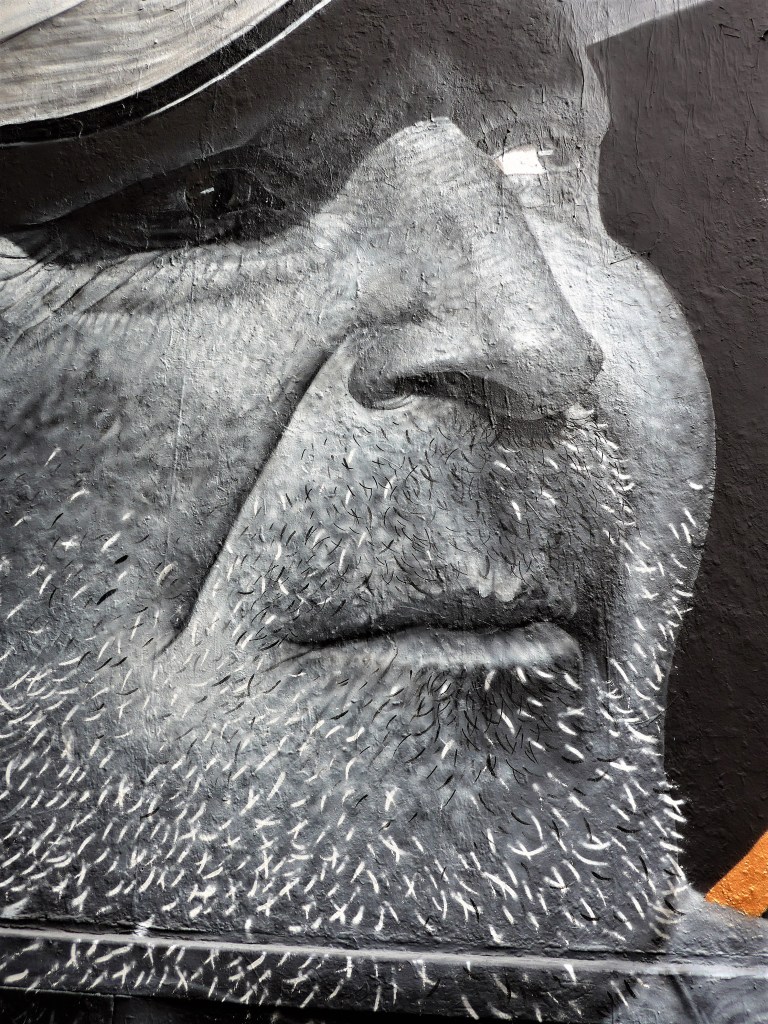Comme chacun sait que « l’ennui naquit de l’uniformité », c’est la raison pour laquelle, j’ai laissé Violant parler de ses deux fresques Pan et Noé. De la même manière, je souhaite éclairer le portrait peint par Swed Oner par le commentaire qu’il en fit en voix off d’une passionnante vidéo réalisée par Laurence Laux pour le M.U.R. Oberkampf [1]et par le texte qu’il diffusa quelque temps plus tard sur Facebook pour introduire les photographies de son portrait.