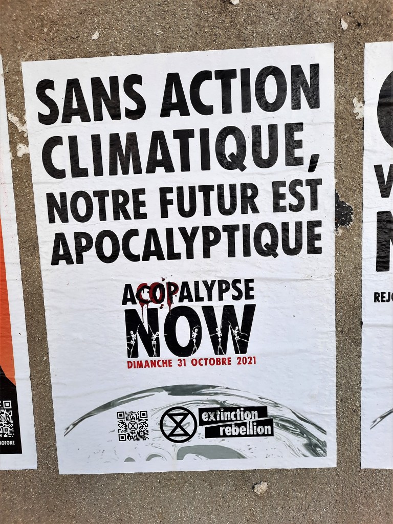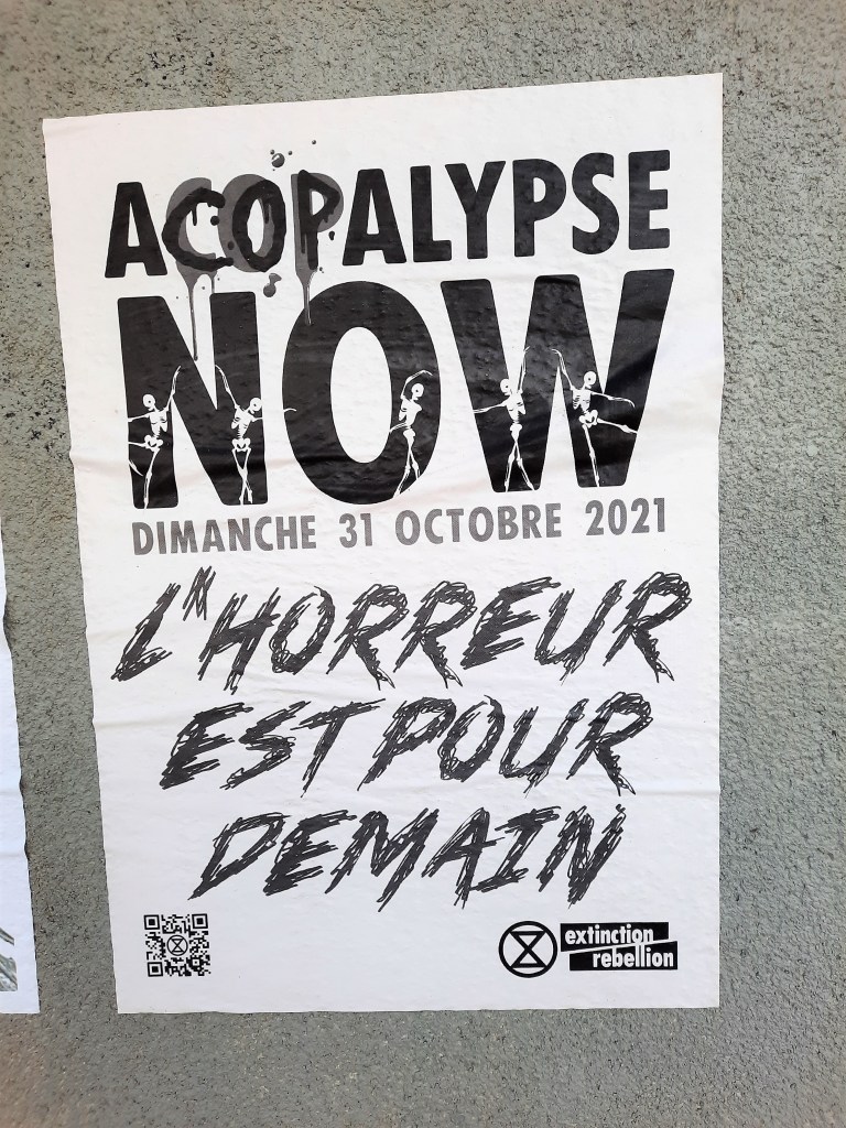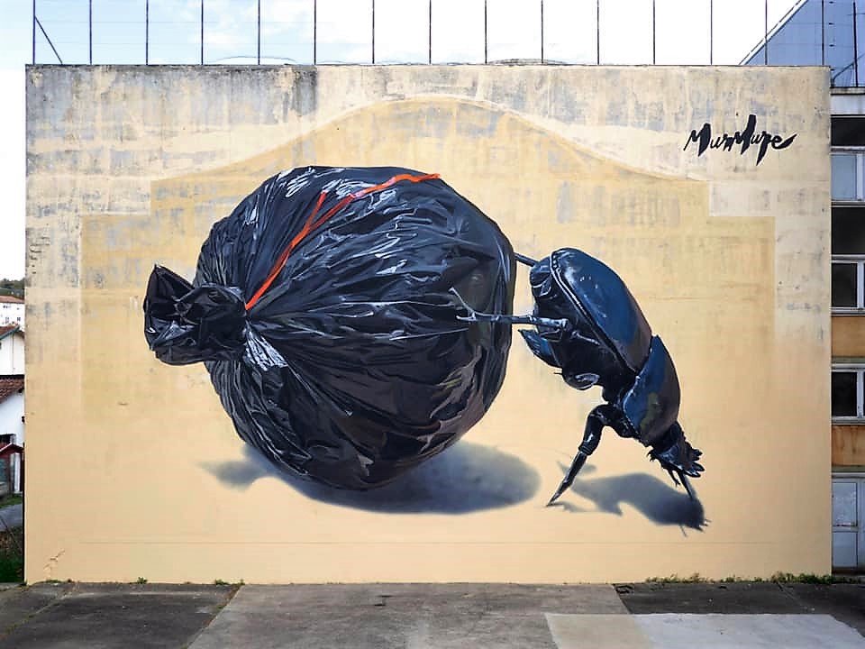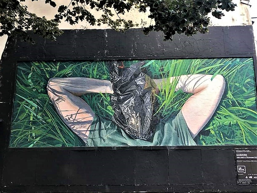 Ce n’est évidemment pas un hasard, la fresque de Murmure a été peinte pendant la COP 26. La mise en relation de la chronologie et de l’œuvre éclaire le sens. Le personnage symbole de l’humanité masqué par un sac poubelle symbole de la consommation de masse et de la pollution par les plastiques se retranche des terribles périls qui menacent l’humanité, jouit d’un plaisir égoïste, hors du monde.