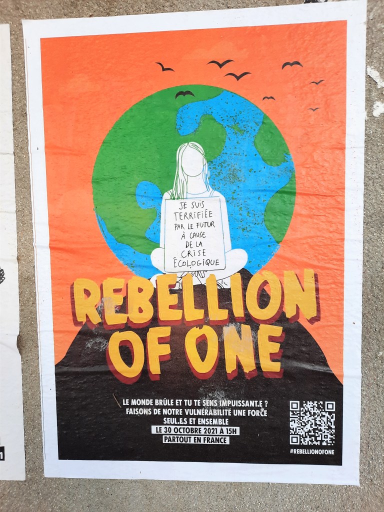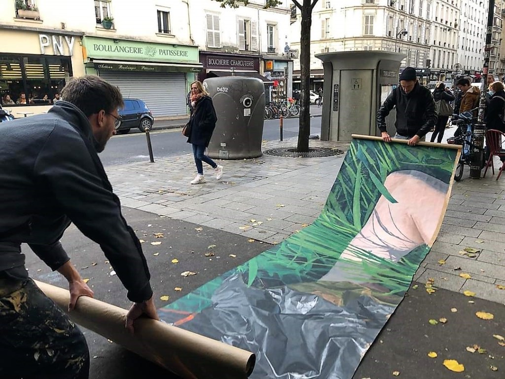 Si l’œuvre est une parabole, il convient d’être au clair sur l’identité du personnage coupable de son inaction. Est-ce qu’il représente l’opinion publique en général ? Ceux (et ils sont pléthore !) qui ne se « bougent » pas ! Les Etats qui seuls peuvent agir pour limiter le réchauffement climatique, la pollution de l’air et de l’eau, la disparition programmée de la biodiversité, les coupes sombres de la forêt amazonienne ? Mon interprétation est basée sur les conditions de l’exposition de l’œuvre. Une fresque urbaine peinte dans un quartier qui grouille de vie, une œuvre qui sera vue par des milliers de « regardeurs », ceux qui prennent un pot dans les bars voisins, les badauds, les chalands, bref tout ce petit peuple de Ménilmontant mêlé aux happy few et aux bobos qui s’encanaillent. Ce sont les destinataires du message de l’œuvre. Un message qu’on peut résumer de la manière suivante : on se sort la tête du sac, on se bouge le cul, on passe en mode action pour faire pression sur les décideurs.
