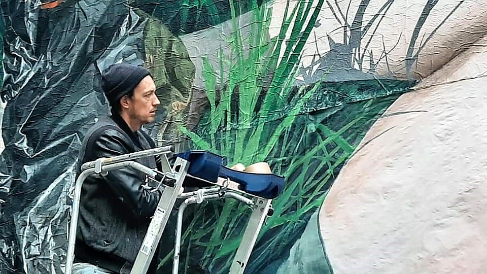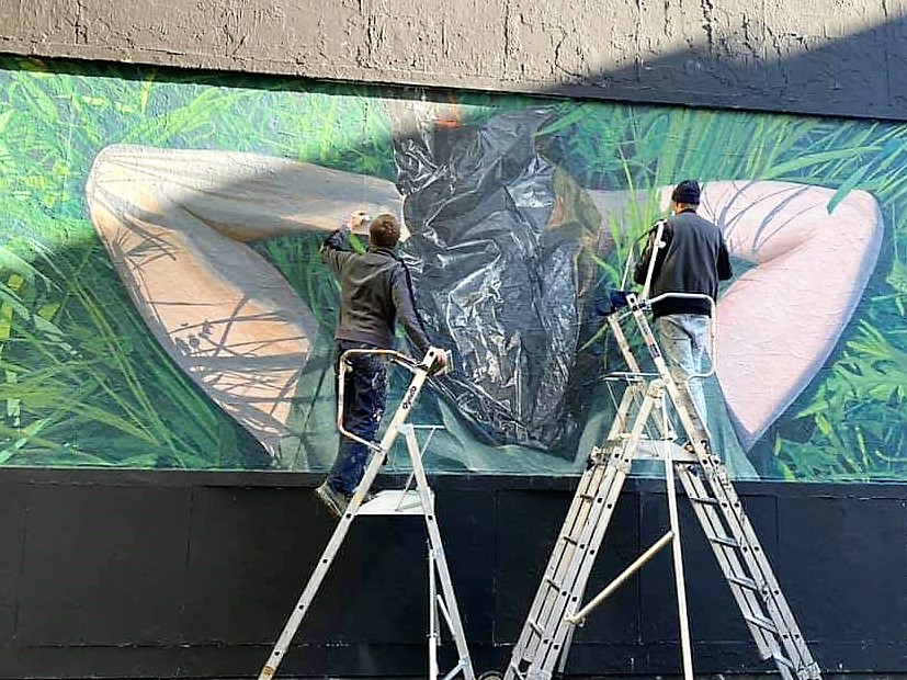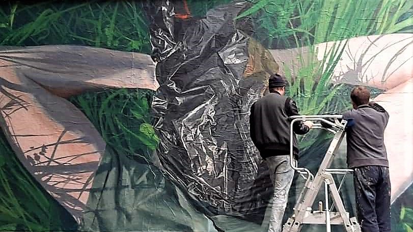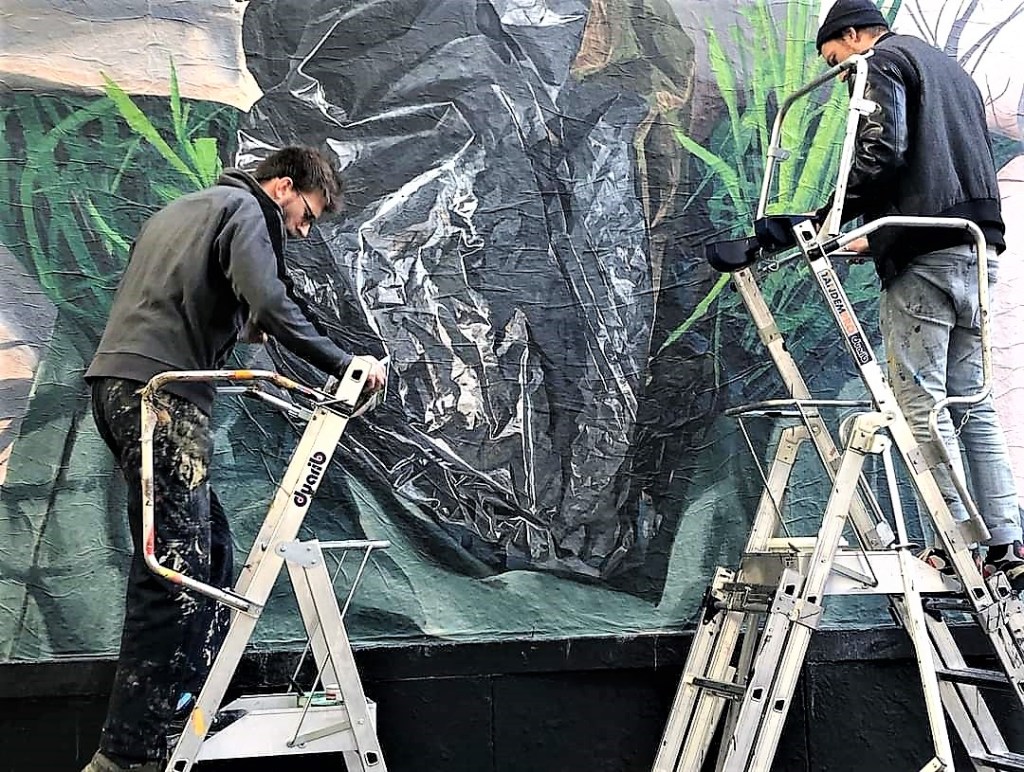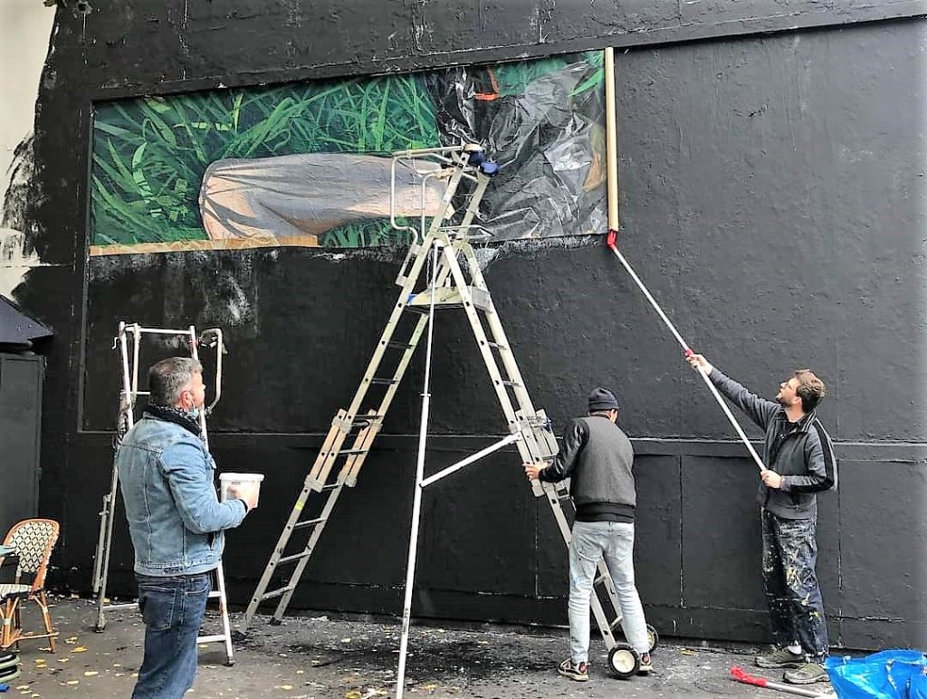 Le 5 novembre, Murmure a déroulé ses rouleaux de papier, étalé sur le mur la colle et collé, comme les pièces d’un puzzle, leur œuvre en morceaux. Les morceaux peints à l’atelier assemblés, ils ont peint des « retouches » afin de parfaire leur réalisation.