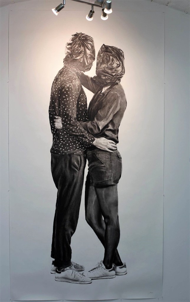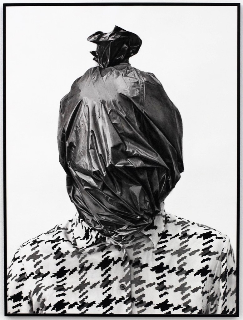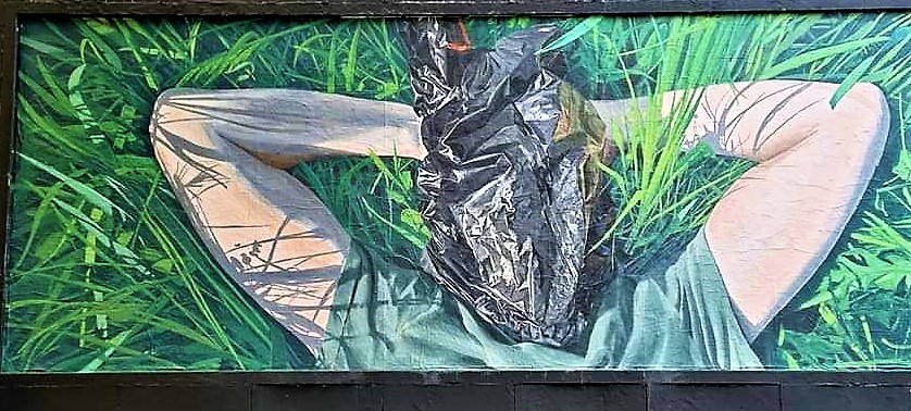 L’œuvre a de quoi surprendre. Elle représente un jeune homme (ou une jeune fille), allongé(e) dans l’herbe haute, reposant sa tête sur ses mains croisées, un sac poubelle noir sur la tête. Une vue de haut, une plongée basse, comme on voudra, centrée sur le haut du corps. Le tee-shirt du personnage est vert, comme l’herbe.