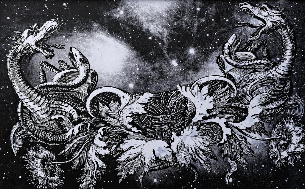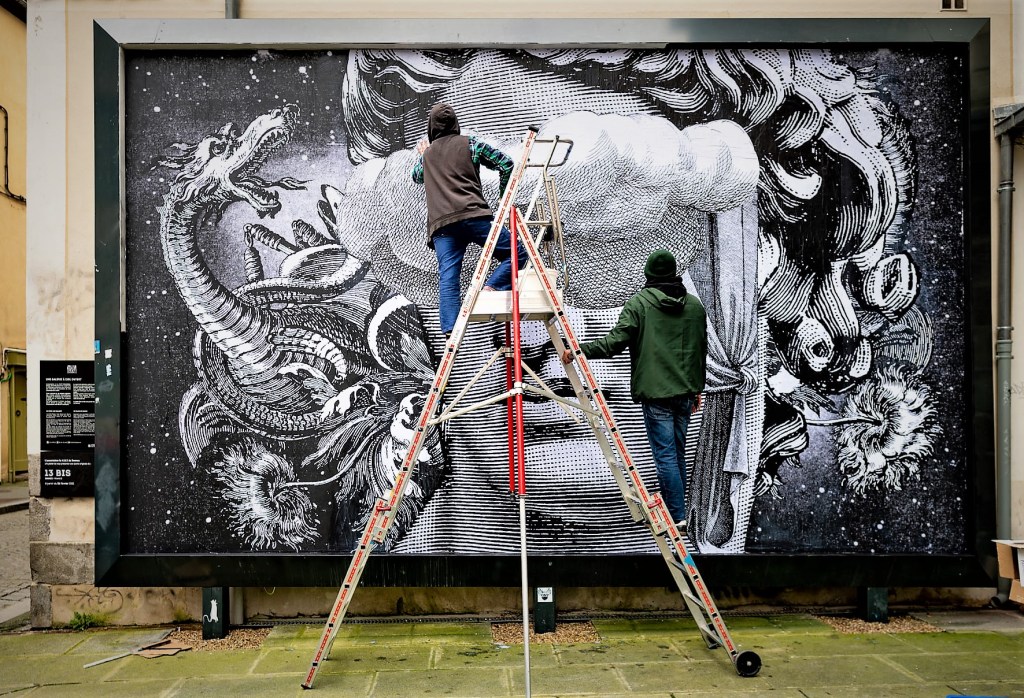 Venons-en tout d’abord à l’aspect matériel de sa création. 13 Bis en quête d’une nouvelle œuvre à produire, recherche des gravures anciennes. Des gravures principalement du 18ème et du 19ème siècle, en noir et blanc. Essentiellement des gravures servant à l’illustration. C’est en feuilletant les livres et en consultant d’autres sources que lentement, au hasard de la découverte des images, se dégage un sujet. La reproduction du sujet servira de base, de fondement, d’architecture, à la création de l’artiste. A la gravure initiale principale, 13 Bis ajoutera des motifs secondaires puisés dans d’autres gravures. Les pièces du puzzle rassemblées forment une image qui est une création originale, c’est-à-dire, une image qui n’a jamais existé auparavant.