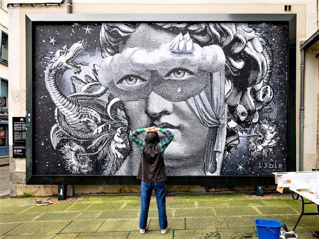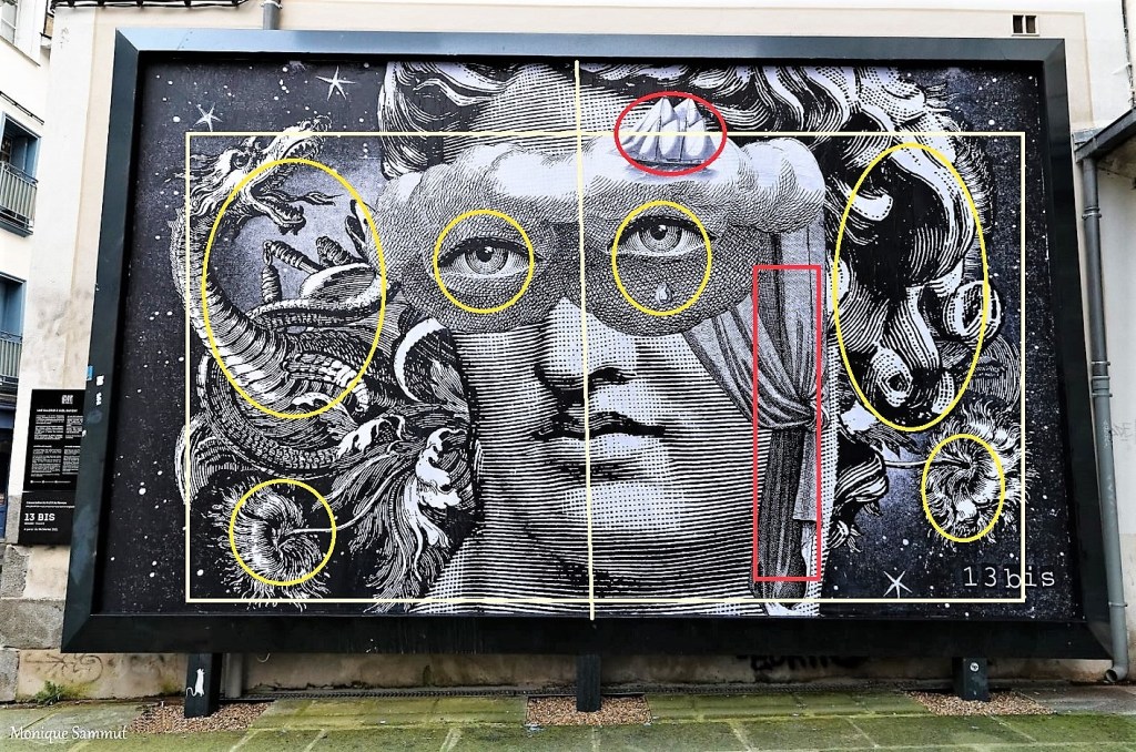 Une recherche le plus souvent vouée à l’échec. Prenons si vous le voulez bien un exemple. La fresque que 13 Bis a réalisée pour le Mur de Rennes est caractéristique de ce qu’il convient d’appeler l’art de 13 Bis. Une figure centrale représente un portrait de femme. Un visage de ¾ regarde un point de fuite extérieur au cadre. Le visage est centré par rapport au milieu du support. Ont été exclus le haut de la tête et la base du cou. Le décor est d’une grande richesse graphique. Un fond de ciel étoilé et de part et d’autre du visage, un dragon combattant un serpent et sur la partie droite, la coiffure. Des fleurs « inversées » font pendant. Le visage est en partie caché par ce qui ressemble à un loup mais qui est en fait un nuage que traversent les deux yeux. Un bateau vogue sur le nuage. Un pan de tissu encadre le côté droit du visage.