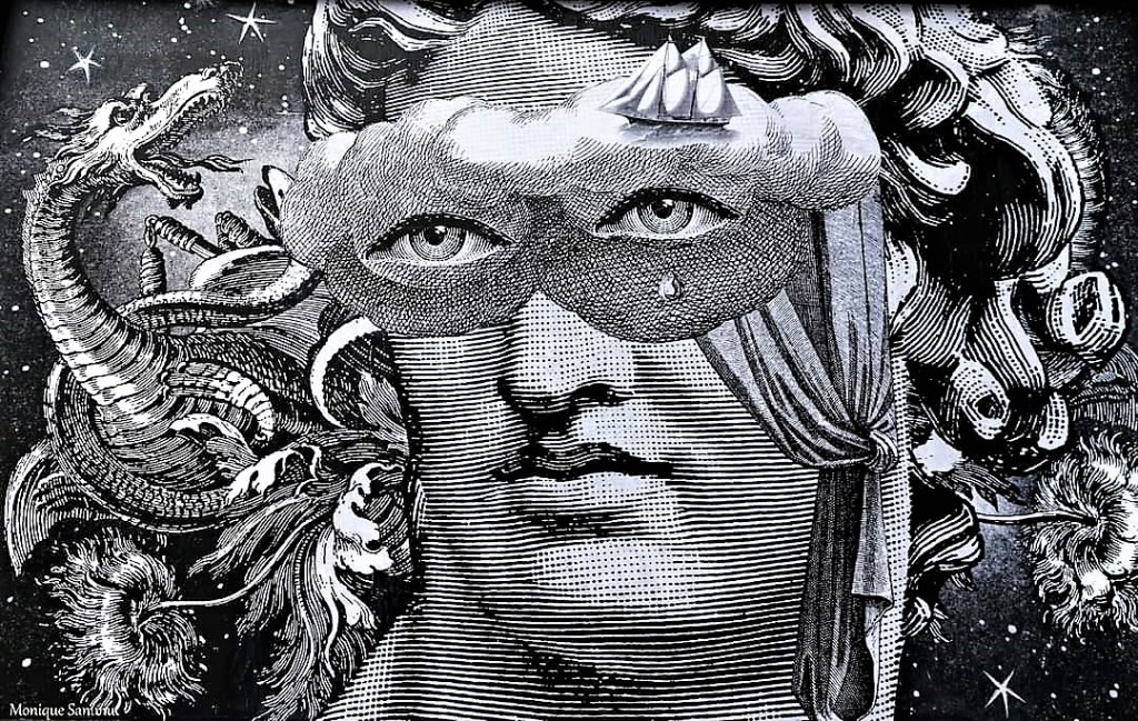 Le visage de la jeune femme est le sujet du collage. C’est un portrait. Le décor est sur deux plans : celui du ciel noir et celui du combat entre le dragon et le serpent et de la coiffure. Le motif fantastique de la lutte du dragon et du serpent qui était symétrique à l’origine a été rompu par des éléments dissymétriques (pièce de tissu, chevelure). La dissymétrie du loup est renforcée par le bateau. Le visage régulier et classique est devenu par l’apport de figures secondaires un mystère.
