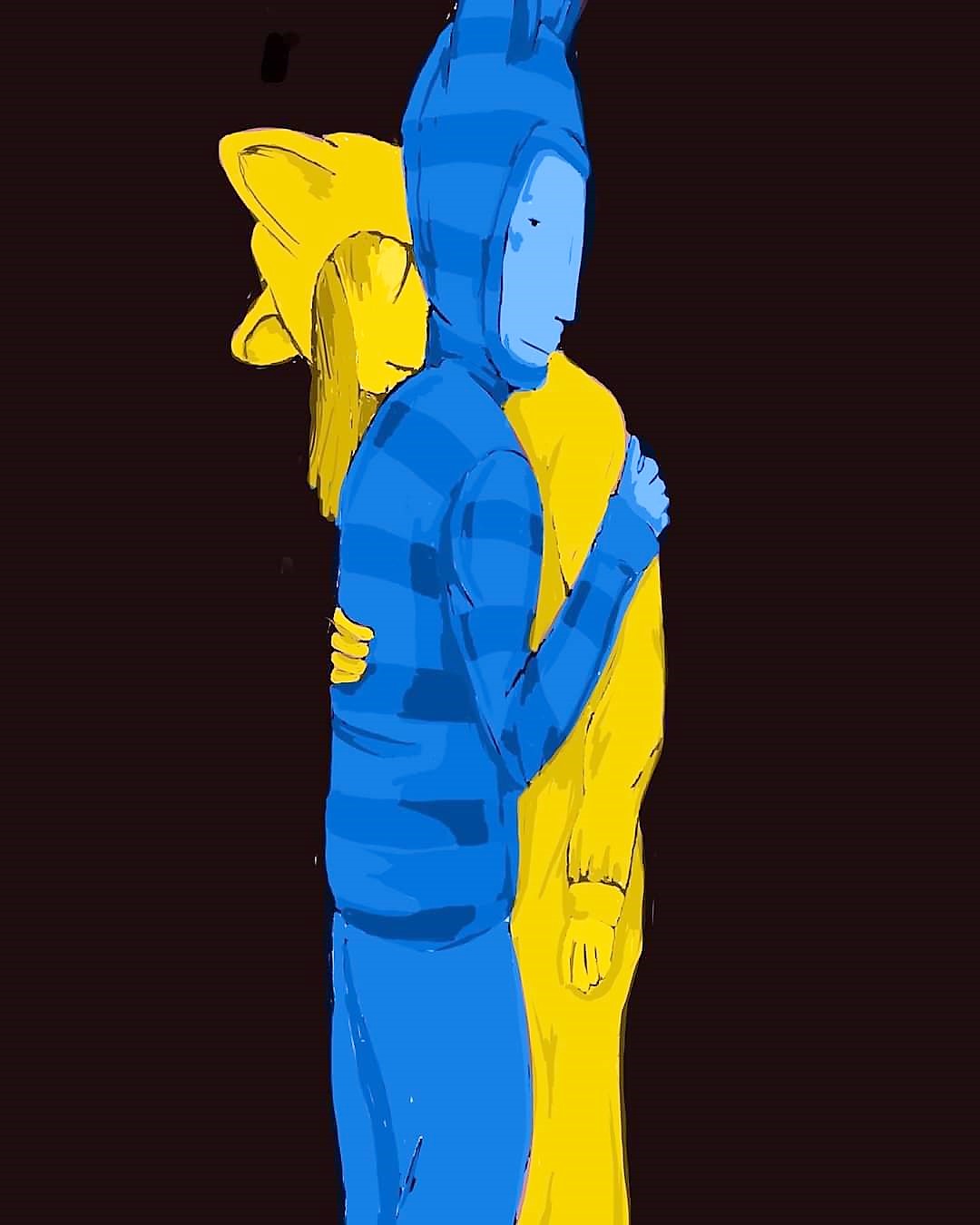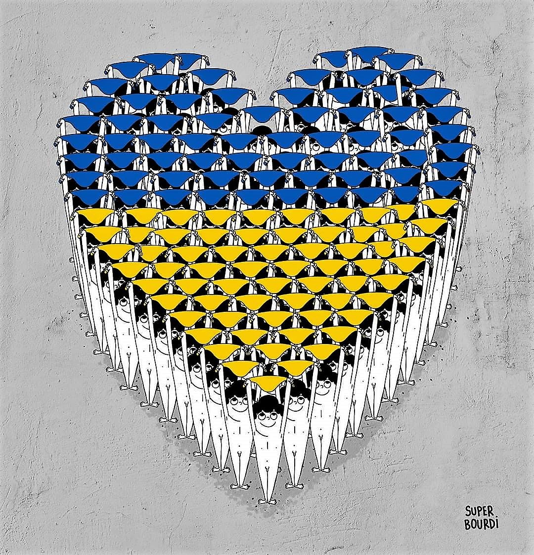 Le dessin du drapeau est repris fréquemment dans l’ensemble des images de soutien et, de manière plus abstraite, dans d’autres plus récentes, ne sont gardées que les bandes jaune et bleue. La forme du drapeau, le symbole national, s’est dissoute dans de nombreux exemples. Les bandes jaune et bleue ne conservent que la couleur, excluant les contours et oubliant le dessin initial du drapeau. A l’heure où j’écris, le vendredi 4 mars, le jaune et le bleu se sont comme échappés des bandes du drapeau. Tout est coloré des couleurs de l’Ukraine, les portraits, les graffs, les photographies, sur tous les continents. En France, de petits rubans jaunes et bleus commencent à fleurir aux boutonnières des hommes et des femmes candidats à l’élection présidentielle, histoire de se démarquer de ceux qui, avant l’invasion de l’Ukraine, trouvaient en Poutine un modèle. Une façon de montrer à l’objectif photo et à la caméra qu’on est dans le bon camp. Lors de la réunion du Conseil de l’Europe à Strasbourg le 2 mars des parlementaires étaient habillés de jaune et de bleu.