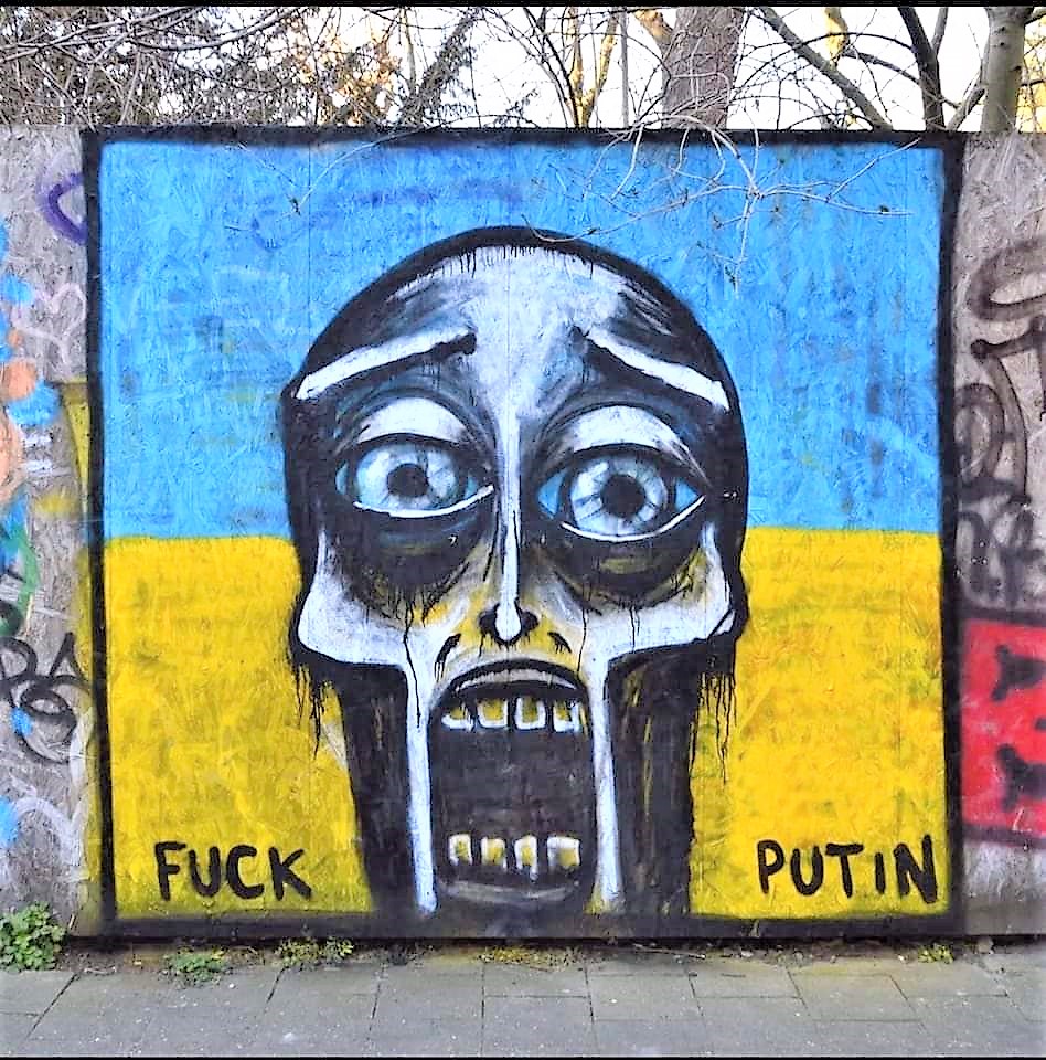Vus de France, les réseaux sociaux n’illustrent qu’incomplètement le conflit entre la Russie et l’Ukraine. Seules sont diffusées les marques de soutien au gouvernement légal. En examinant des milliers d’images depuis le début de l’invasion, je n’ai trouvé aucune image, aucun texte soutenant la décision du président de la fédération de Russie. A croire que personne en occident et ailleurs ne soutient Poutine ! A moins que ce soit les réseaux sociaux étasuniens qui censurent d’éventuels messages de soutien à l’armée russe. A moins que les états qui soutiennent l’Ukraine ne soient intervenus auprès des susmentionnés réseaux sociaux pour filtrer les messages ! Bref, le matériau dont je dispose étant celui véhiculé par Instagram et Facebook, je ferai ce qu’il est possible de faire : rendre compte par l’analyse des images et des œuvres de street art du conflit en Ukraine.