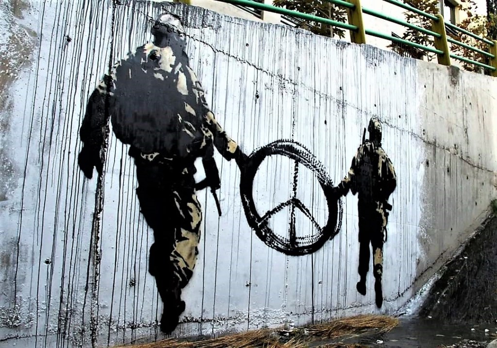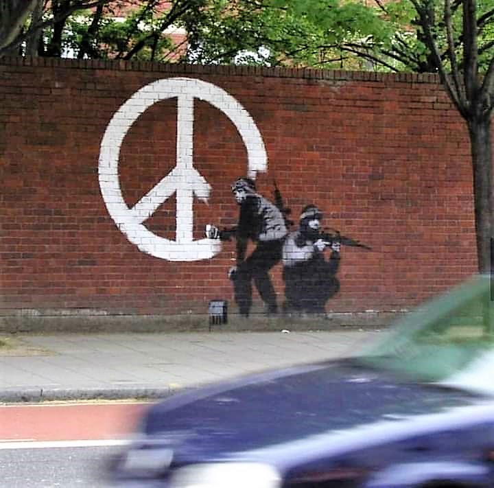Il n’est guère étonnant de retrouver dans les œuvres des street artistes des symboles de la paix. Ils sont nombreux et sont dans une très large mesure universels. La colombe, l’olivier et son rameau, le drapeau blanc, la croix rouge, le drapeau arc-en-ciel, le drapeau olympique aux 5 anneaux, la grue en origami, le calumet, le coquelicot blanc, le fusil brisé sont quelques-uns de ces symboles.