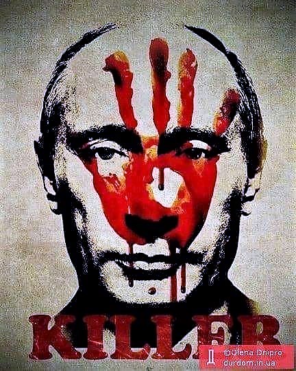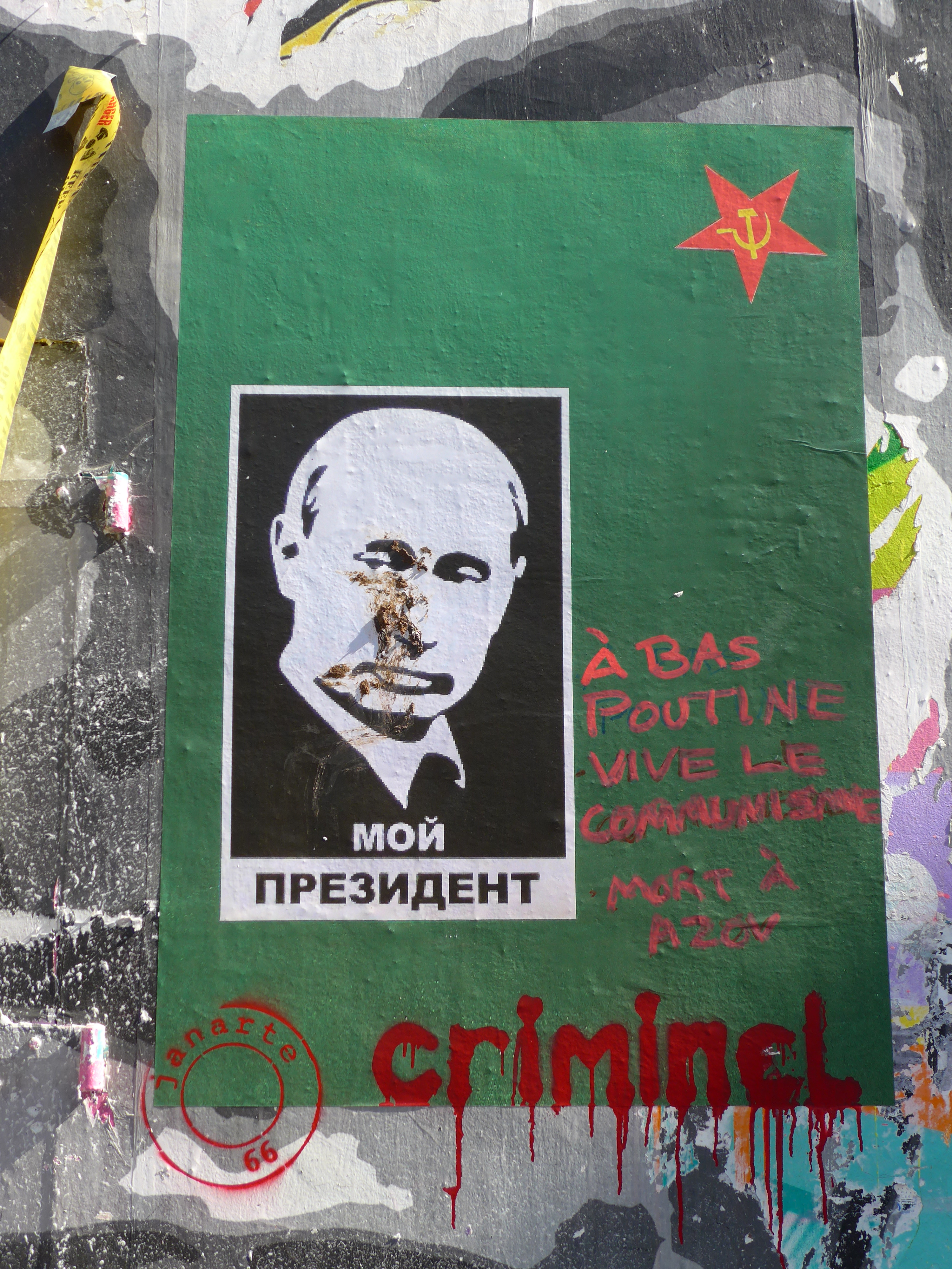Zelensky, le président-simple soldat, le héros positif, combat l’ogre Poutine, le président de la deuxième puissance nucléaire mondiale, le président du plus grand pays du monde. Pour être reconnu comme un héros, il faut, nous l’avons vu, que son adversaire soit redoutable voire invincible. Les artistes pour représenter Poutine n’ont guère hésité à charger la barque. Qu’on en juge ! Il est présenté comme un tueur cruel, un terroriste, celui qui a tué la paix. De plus, il est insulté et ridiculisé. Comparé explicitement au diable, sa représentation est associée au sang. C’est un dictateur, comme Hitler et Staline, un dictateur qui est un nazi par une inversion des justifications de Poutine à l’invasion de l’Ukraine. Plus trivialement, c’est un déchet mal odorant (en jouant sur son nom en anglais : put in). Bref, une sinistre incarnation du Mal absolu.