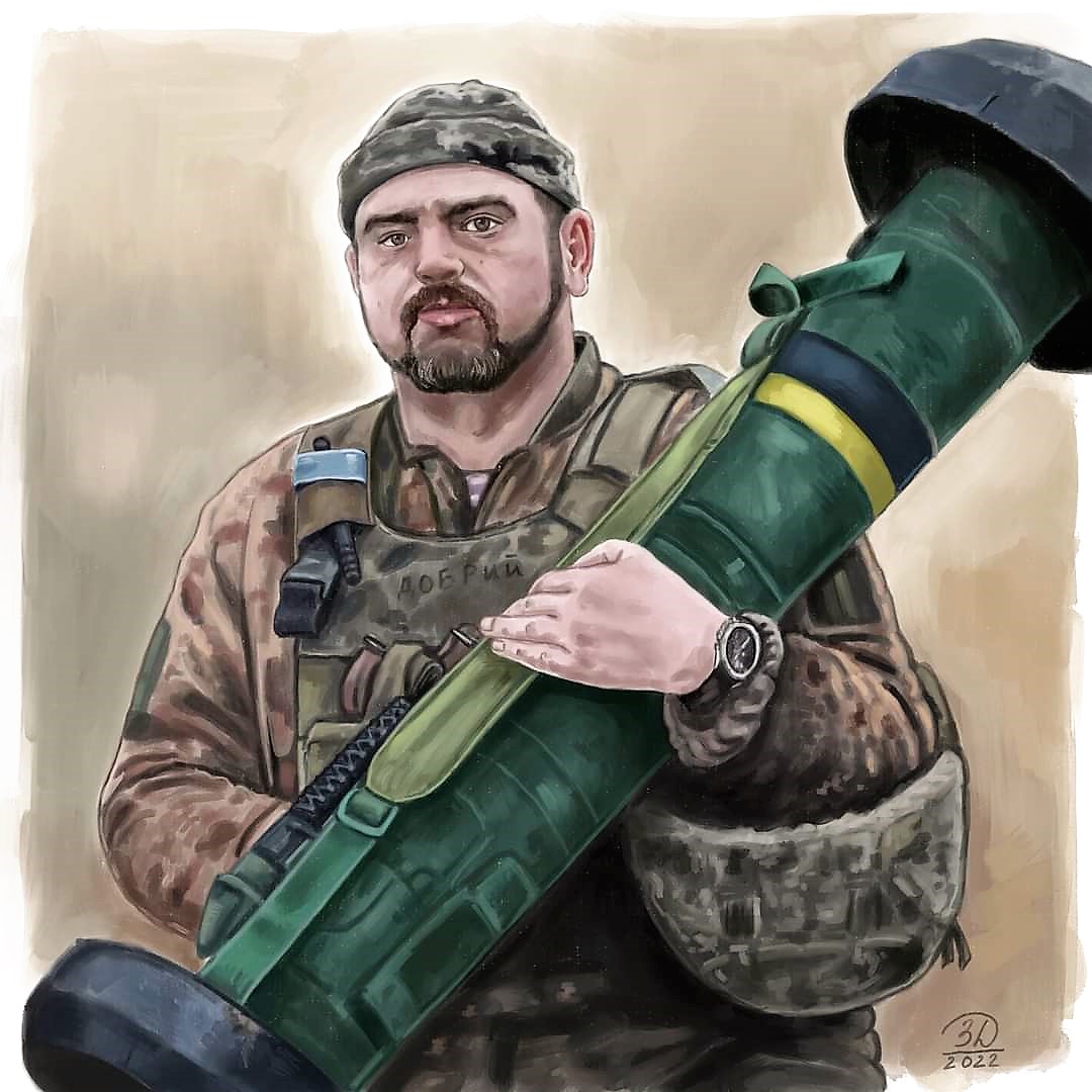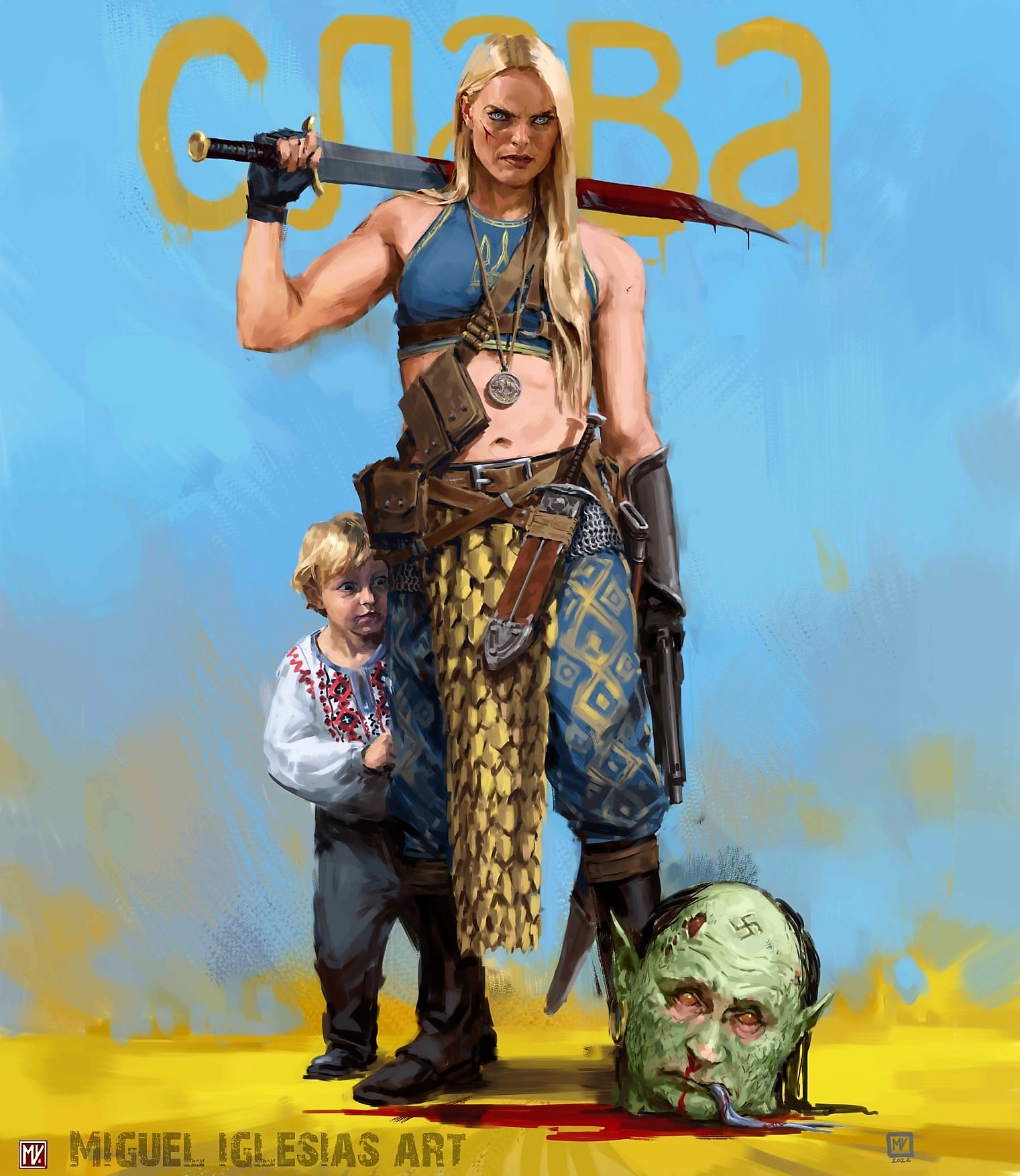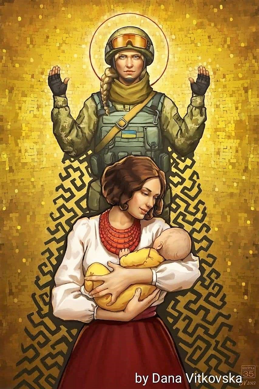 En parallèle, des images construisent les bases de ce qui sera le roman national. Le soldat devient une figure majeure de la mythologie qui se crée. Il est représenté avec ses armes sortant des flammes du combat, fort, viril et protecteur. Les héros des légendes sont convoqués afin d’inscrire l’actuelle conflit dans l’histoire de l’Ukraine. Héros protecteurs et protégés par Dieu. C’est dire suffisamment clairement que la guerre des Ukrainiens est juste et qu’ils incarnent les forces du Bien. Les symboles saturent les représentations : le drapeau, les couleurs du drapeau, les fleurs des champs dans les cheveux des femmes, le blé des plaines, le culte marial, le trident.