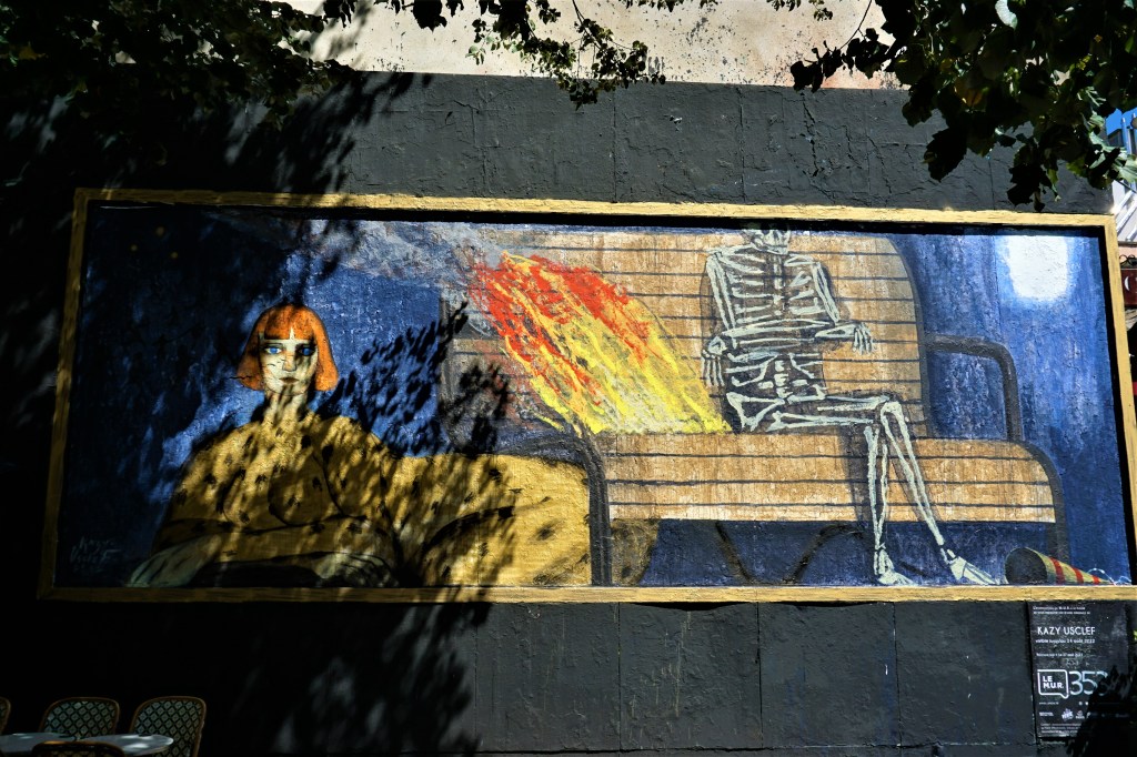 Première quinzaine du mois d’août 2022, le M.U.R. Oberkampf a invité Kazy Usclef. L’artiste nantais a peint une œuvre qui surprend. Sur un fond d’un bleu nuit se détache une lune blafarde. Sur un banc public sont peints deux sujets : un squelette qui croise bras et jambes, et à côté de lui, un feu ardent. En partie cachée par le banc, couchée dans son prolongement, une sphinge. Dans le coin droit, un cône blanc et rouge posé sur le sol.