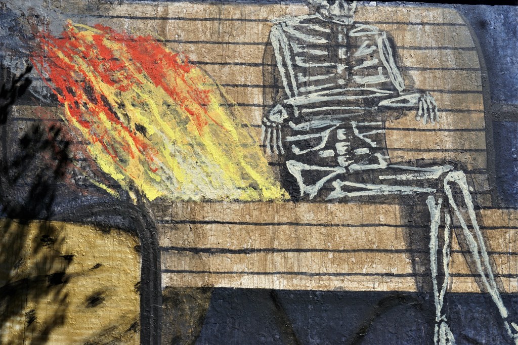 Quelle histoire nous raconte l’artiste ? Car il s’agit bien de cela. Sa fresque nous raconte une histoire. Une histoire vieille comme le monde. La sphinge moderne fait ce que font toutes les sphinges depuis la nuit des temps, elle propose aux passants que nous sommes des énigmes et si nous n’y répondons pas nous encourrons le châtiment suprême, nous serons réduits d’abord à l’état de squelette, un état de passage, avant la crémation et les flammes de l’enfer.