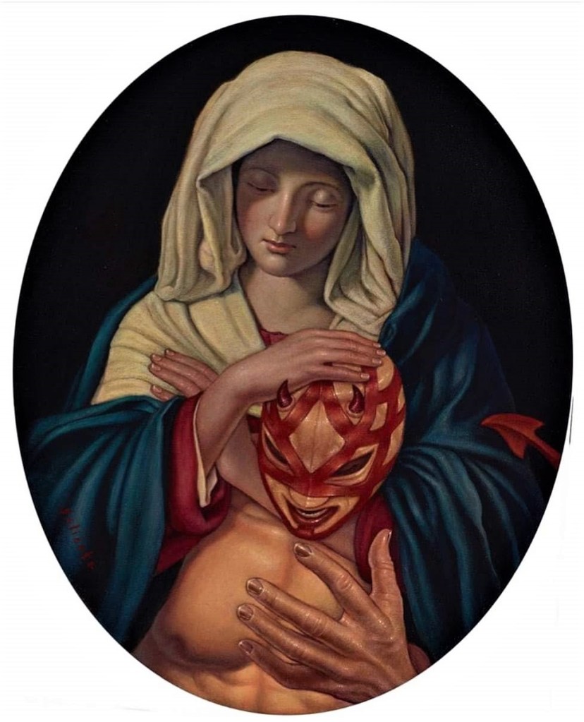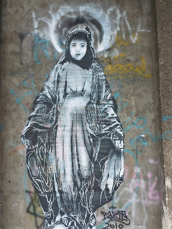 Il est somme toute assez bizarre de constater que les images de la Madone et de la Vierge Marie produites par les street artistes sont des copies des images sulpiciennes. Comme si, Marie et l’enfant Jésus étaient des personnes véritables dont l’aspect était figé une fois pour toutes. Cela n’est pas sans évoquer la crise iconoclaste de 1566 et sa traduction actuelle dans certaines religions, comme l’Islam et le protestantisme.