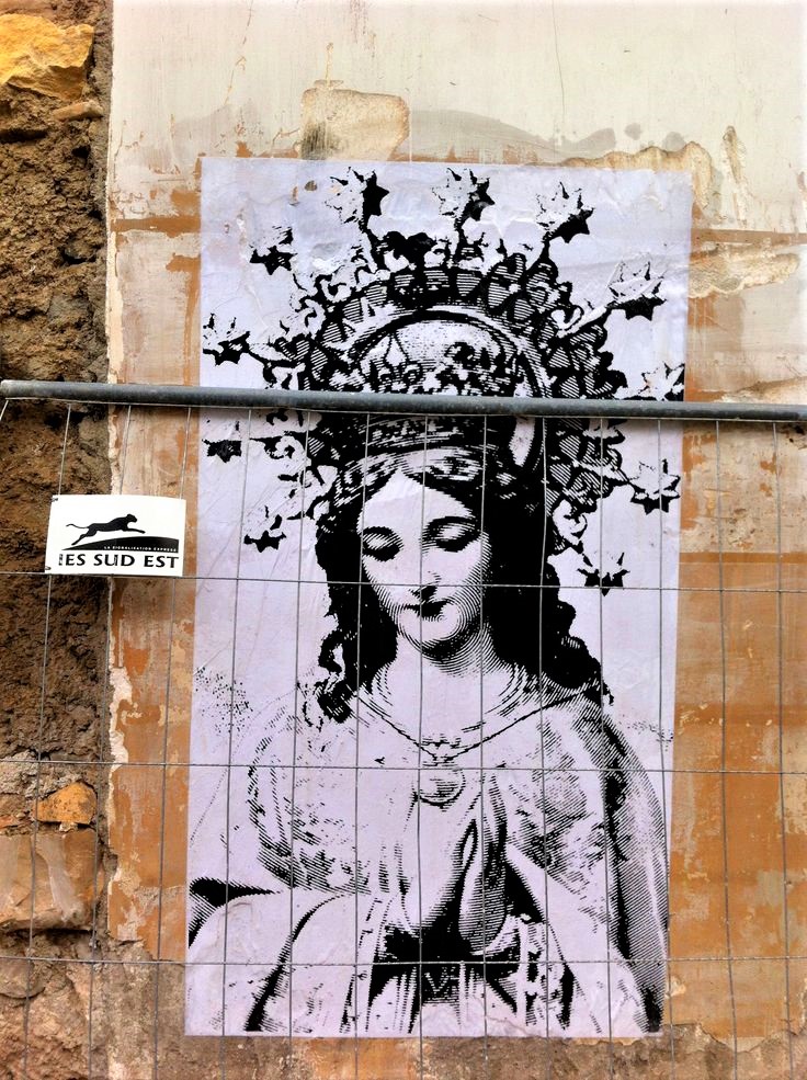 J’avais à l’esprit ces catégories quand, lors d’une promenade, j’ai vu un pochoir représentant une Madone, c’est-à-dire, une représentation d’une Vierge à l’enfant. J’ai été surpris de trouver sur un mur une « image pieuse », un exemple, modeste il est vrai, d’une peinture qu’il faut bien qualifier de religieuse.