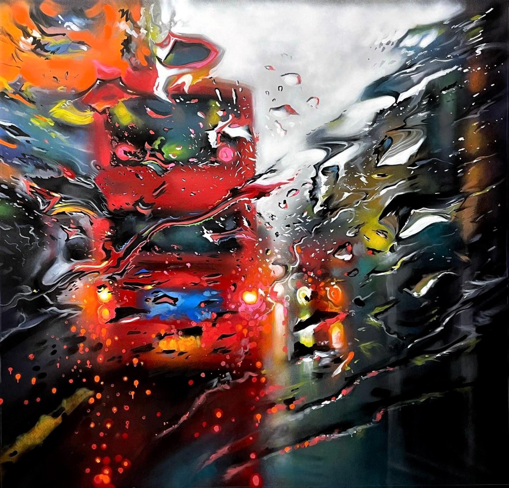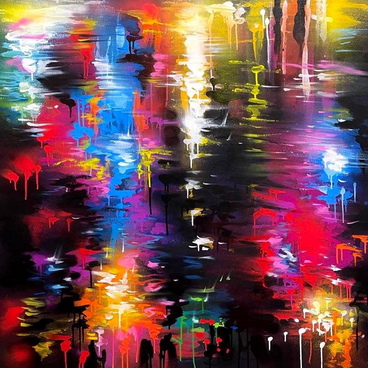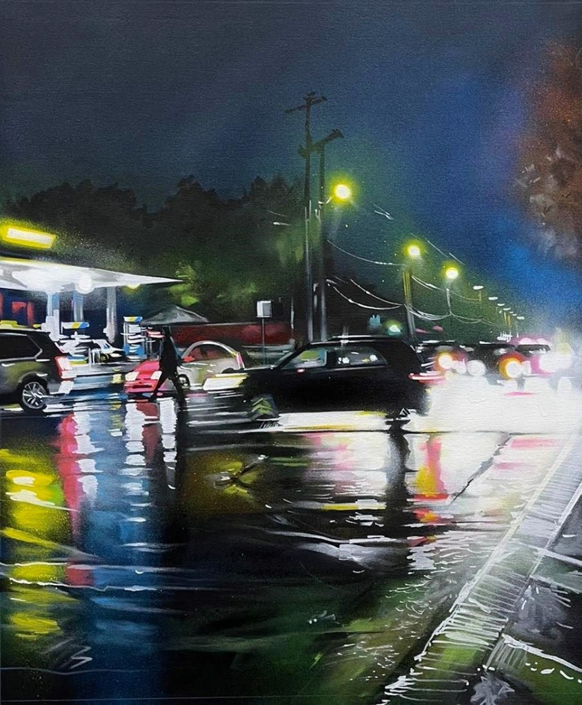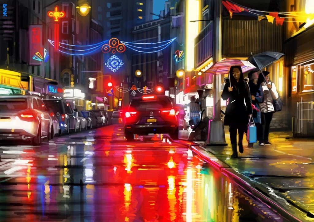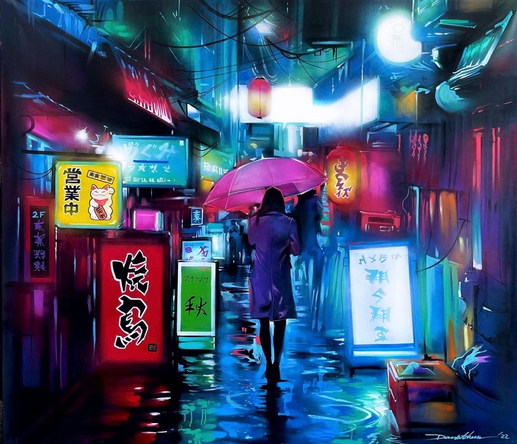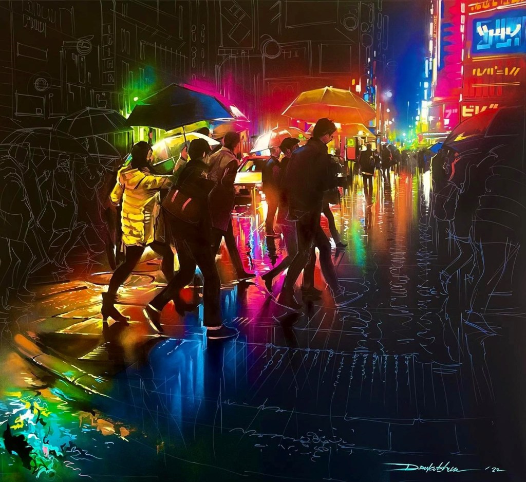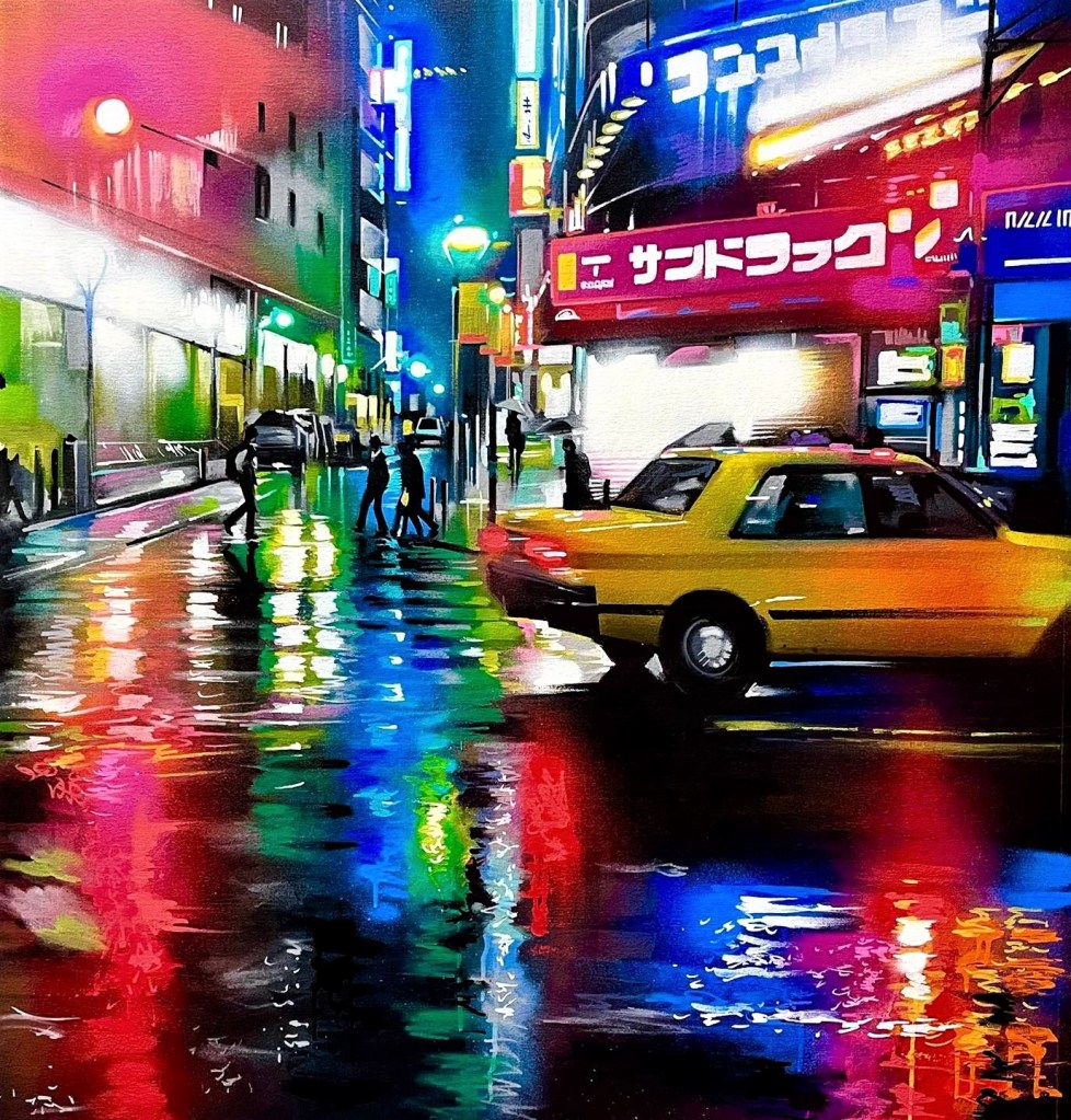 Regardons l’ensemble des scènes de rue. Ce sont des paysages urbains bien spécifiques de rues commençantes animés. Des paysages qui ne sont pas centrés sur un objet et détourant objet et décor, mais le sujet est le décor. Un ensemble baigné par l’obscurité qui fait briller les néons et les éclairages des vitrines, lumières se reflétant sur la chassée mouillée. Si les rues inventées s’inspirent de la rue japonaise, c’est que cette rue est unique par l’omniprésence et la densité des enseignes lumineuses, par la densité de ses foules. Ce n’est pas l’abondance des objets à représenter qui aiguise l’imagination du peintre, c’est la lumière. Lumières aveuglantes des néons pour attirer le chaland, variétés des couleurs des néons (toutes les couleurs sont possibles ainsi que tous les mélanges de couleurs obtenus par les diffractions)