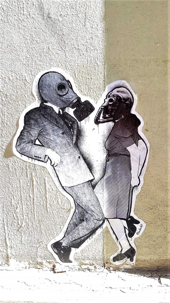 Or, les artistes cherchent à créer des images, des images faciles à « lire » afin de provoquer une prise de conscience et exercer une pression sur les politiques. Un coup de billard à trois bandes. Seulement, l’air, y compris l’air pollué, est transparent ! Il y a bien une foultitude de particules mais elles sont microscopiques ! Une solution eut consisté à grossir les particules comme d’autres l’ont fait pour le virus de la Covid. Une autre solution lui a été préférée : peindre des personnages portant un masque. Ce que firent certains street artistes. Cela fit long feu ! L’arrivée de la pandémie de Covid et ses très fameux masques chirurgicaux changea la donne.
