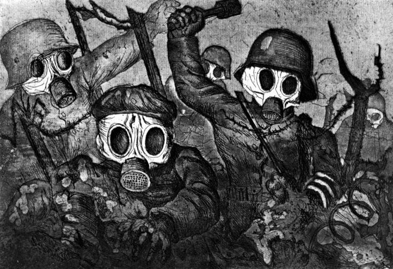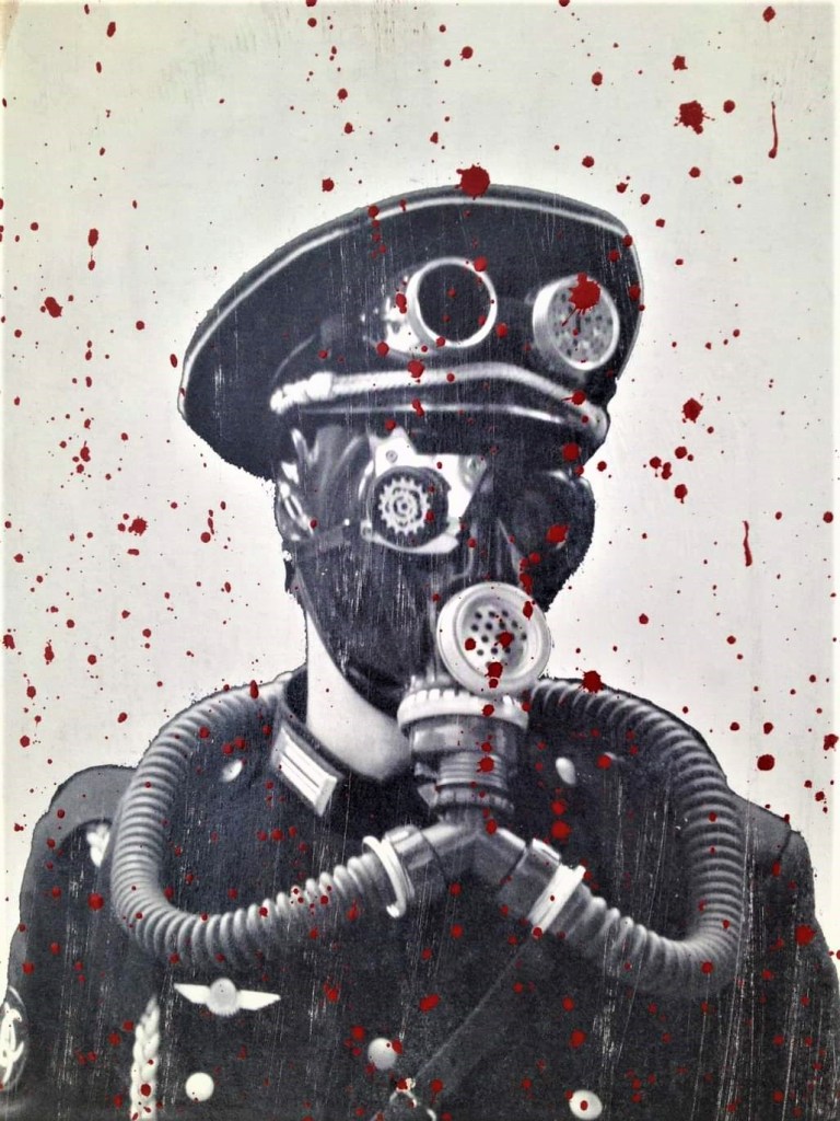 On pourrait penser, dans un premier temps, à l’influence des gravures et des peintures d’Otto Dix. Il est vrai que la référence semble s’imposer ; des fresques sont de quasi copiés-collés des œuvres de Dix. Si, en n’en pas douter, le souvenir de ces gravures universellement connues peut expliquer l’emprunt, je pense que ça n’explique pas ce que je considère comme un phénomène : l’adoption de la représentation du masque de guerre, version 14-18.