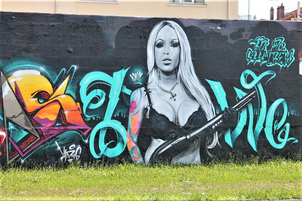 Ce n’est pas nouveau me direz-vous et j’en conviens aisément. Par contre, ce qui me parait nouveau, c’est l’association qui est faite par certains artistes entre nudité, sexualité et symboles de la violence. Ce n’est pas une déclinaison des fameuses pin-up des années 50[1] qui a fait long feu. Je vois dans ce changement des codes de représentation des femmes une illustration de la révolution féministe qui traversent les sociétés occidentales. Une rupture des codes esthétiques et plastiques correspondant à une rupture radicale dans nos représentations sociales des statuts des hommes et des femmes. Ainsi, par exemple, nous trouvons des œuvres représentant des femmes érotiques associées dans des scènes à des objets tels que Kalachnikov, revolvers, cocktails Molotov, battes de baseball, poings américains etc. Une esthétique fantasmée issue d’une culture des limites, voire underground.
