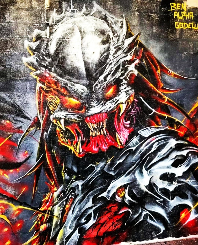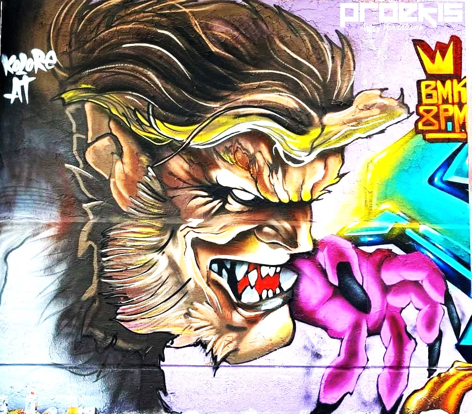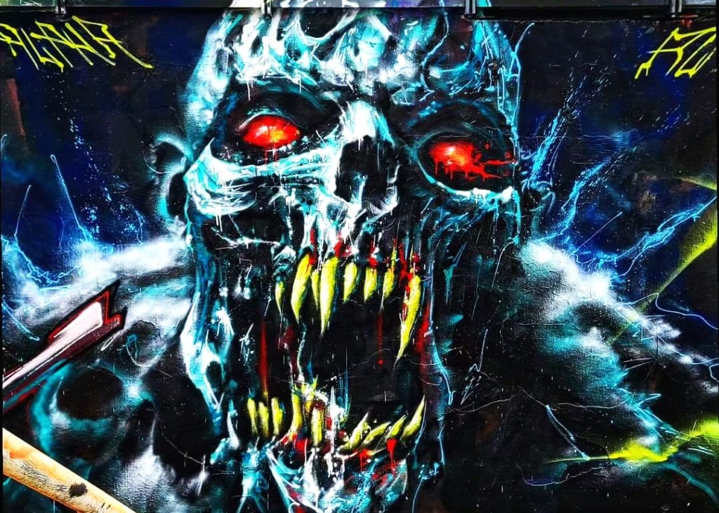 Les figures de la peur dans le street art occidental sont pléthore. Dans les articles précédents, j’ai abordé plusieurs de ces figures : les figures représentant explicitement la mort (skulls, cadavres en voie de décomposition, squelettes) et tout un embrouillamini de symboles renvoyant à la Grande faucheuse (potences, gibets, instruments de torture, cimetières, corbeaux, sabliers etc.), les figures peu ou prou religieuses (Satan, les flammes de la damnation éternelle et ses tourments, les anges déchus etc.), les animaux inspirant la terreur (par la dévoration, le poison etc.), les icônes du cinéma d’horreur tel le Joker.