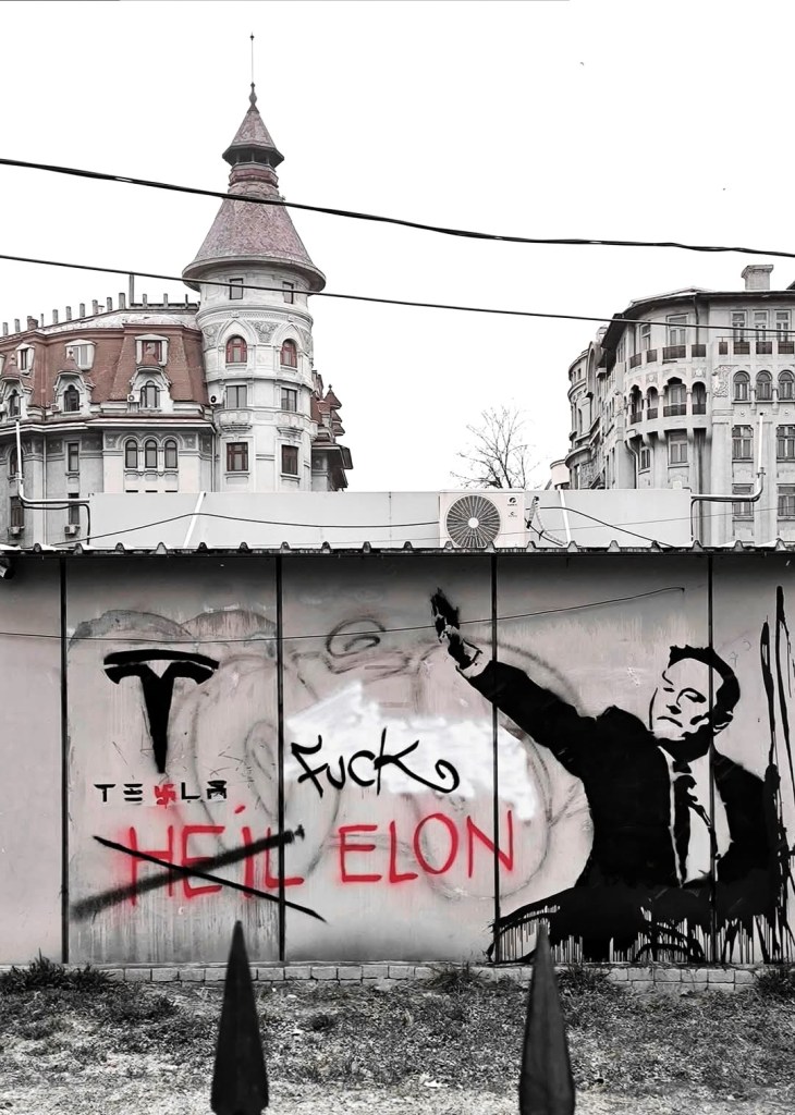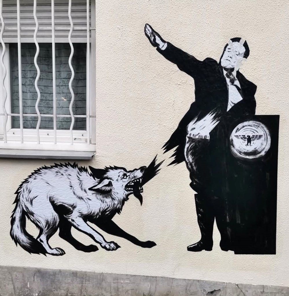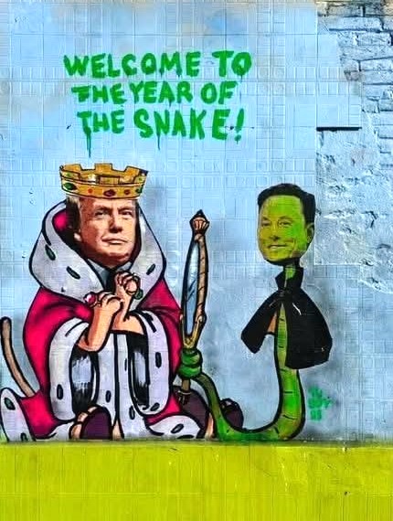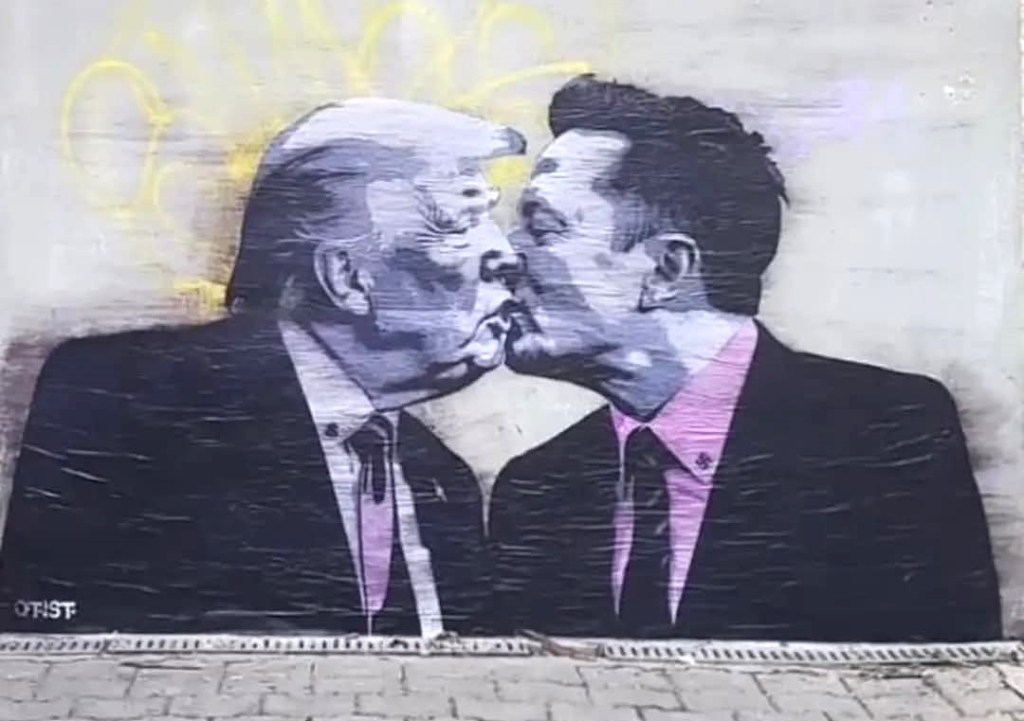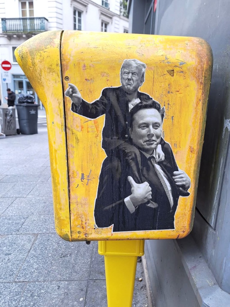 Le duo Trump/ Musk est intéressant à plus d’un titre. Musk est, dans un premier temps, ridiculisé. Nombre de street artistes ont représenté son « salut nazi ». Les artistes ne se perdent à conjectures pour savoir si le salut de Musk est un signe manifestant sa complicité avec son auditoire ou un salut identifié comme un salut nazi. C’est pour tous un nazillon ridicule.