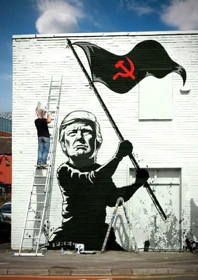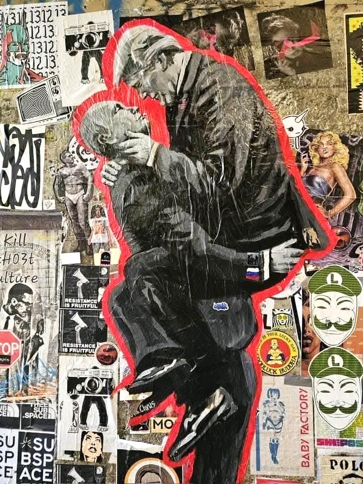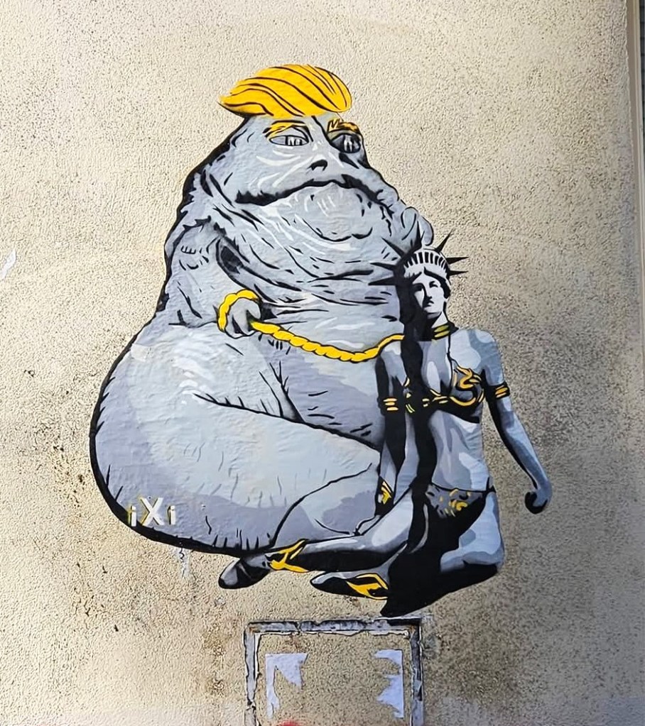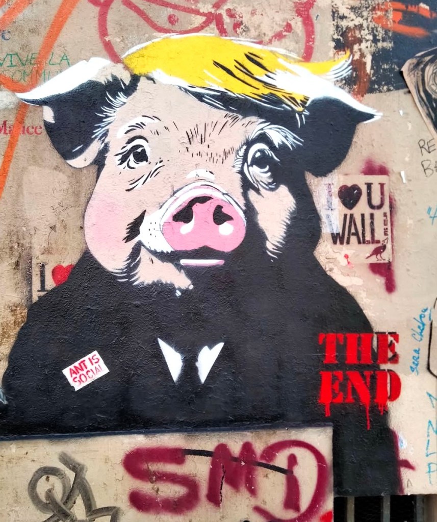 Toutes les fresques ayant comme thème la politique américaine mise en œuvre par Trump sont des caricatures. Il ne s’agit pas pour l’artiste avec une simple image d’expliquer une situation complexe. Le but est tout d’abord de réagir le plus vite possible à l’actualité en utilisant deux moyens : faire rire, se moquer, pour réduire à néant le crédit des puissants, donner une image schématique immédiatement comprise des « regardeurs », une image appartenant à la culture iconographique des badauds, pour qualifier la nature des relations entre les personnages.