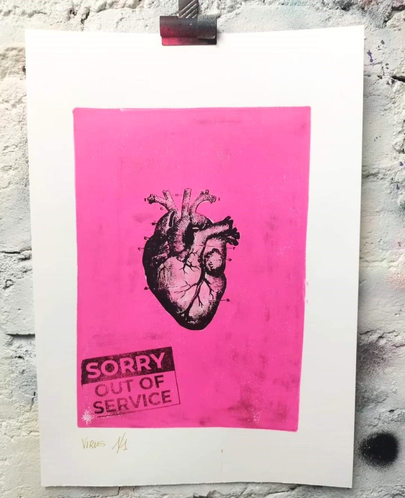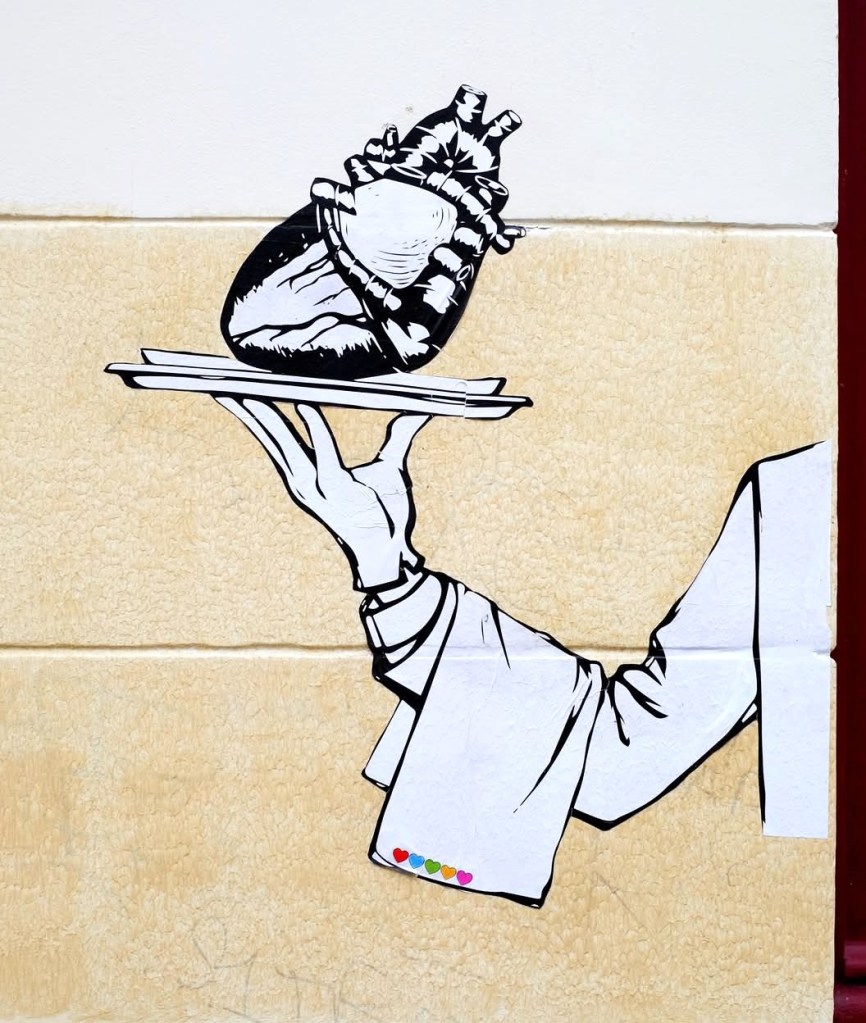 Mon hypothèse est que le cœur « feuille de lierre » s’est imposé comme un symbole universel, un symbole intégrant toutes les formes d’amour. De l’amour courtois à la passion amoureuse. Dans le même temps, l’image du Sacré-Cœur, grâce à l’Église catholique s’est popularisée. C’est à mon sens cette image forte qui a perdu sa signification religieuse qui continue à inspirer nos street artistes modernes.