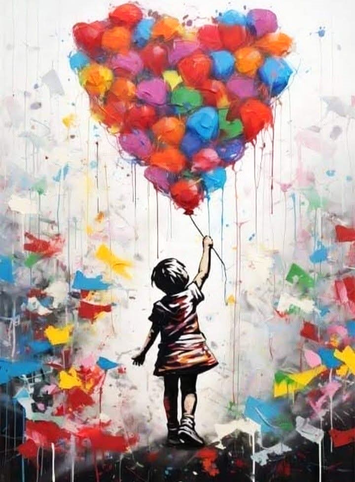 Dans bon nombre de détournements, la petite fille est représentée seule. Les artistes jouent sur la taille du ballon qui devient un énorme cœur ; le ballon est remplacé par un bouquet de fleurs ( une synthèse amusante qui détourne deux œuvres de Banksy en les réunissant) ; le ballon est multiplié de sorte qu’il devient un aérostat qui emporte la petite fille vers le ciel ; le ballon dont la petite fille voulait se saisir a été attrapé et il est tenu par une ficelle ; le ballon est aux couleurs de la Palestine et revendique la fin du conflit ; la petite fille sans son ballon est devenu un personnage, elle illustre des revendications écologiques.