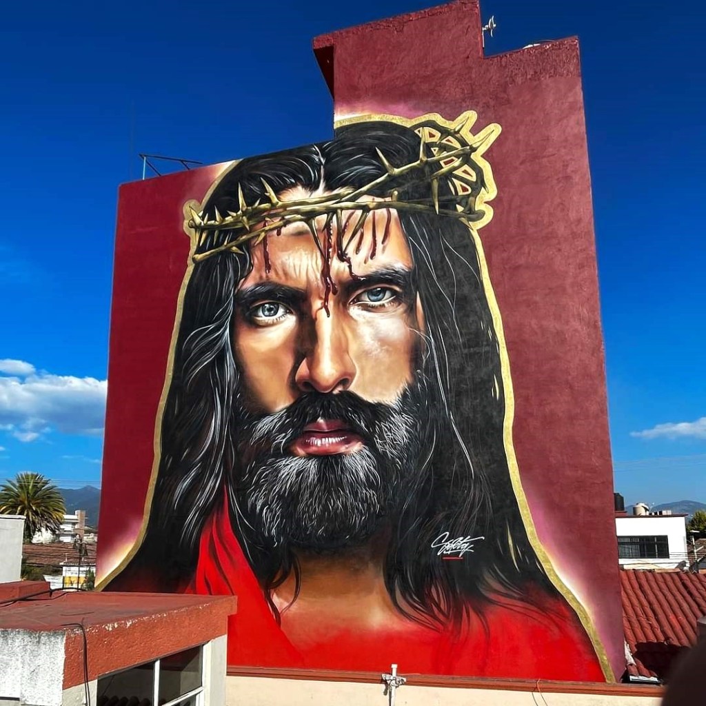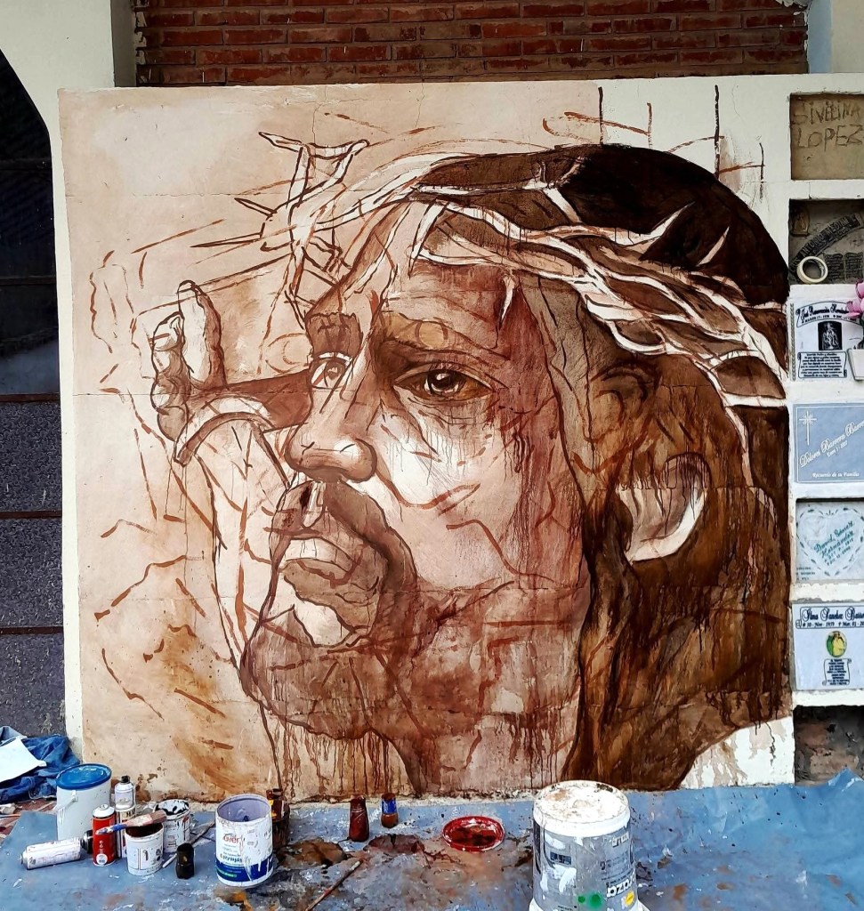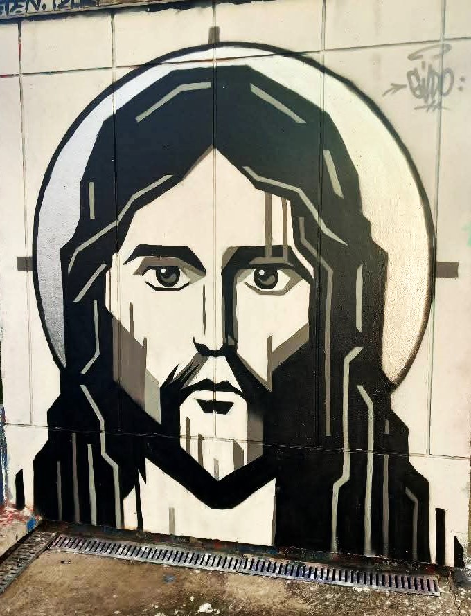 Les street artistes ont changé la focale des peintures d’église. Ils ont centré leurs fresques sur le visage du Christ ceint de la couronne d’épines. C’est alors l’expression du visage qui doit rendre compte de la souffrance du Christ. Ils rompent de cette manière avec les images des crucifix et la représentation du Golgotha, Jésus sur la croix entouré des deux larrons.